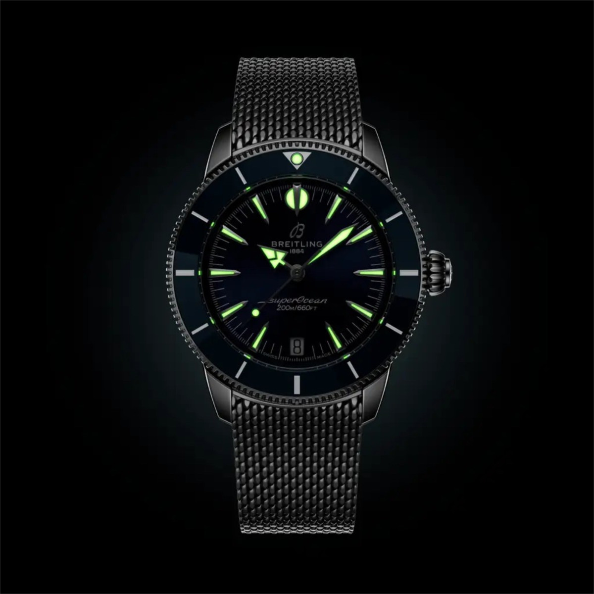 Auch heute noch ist diese Philosophie das Herzstück der Superocean Heritage. Die Seele der 50er Jahre, aber im neuen Kleid für die Gegenwart. Die neueste Superocean Heritage baut auf allem auf, was das Original unverwechselbar gemacht hat, und verfeinert es. Die Kollektion führt das Automatik-Uhrwerk B31 ein, Breitlings erstes exklusives Manufaktur-Kaliber mit drei Zeigern. Eine Lünette mit Keramikeinlage bietet außergewöhnliche Kratzfestigkeit, während die integrierten Armbänder aus Mesh-Metall oder Mesh-Kautschuk eng am Gehäuse anliegen und mit Faltschließen für ein sauberes, wasserdichtes Finish gesichert werden. Ein diskretes Datumsfenster auf sechs Uhr und die originalen Signaturzeiger– Pfeil für die Stunden, Speer für die Minuten – sorgen für Ablesbarkeit und Ausgewogenheit, über oder unter der Oberfläche.