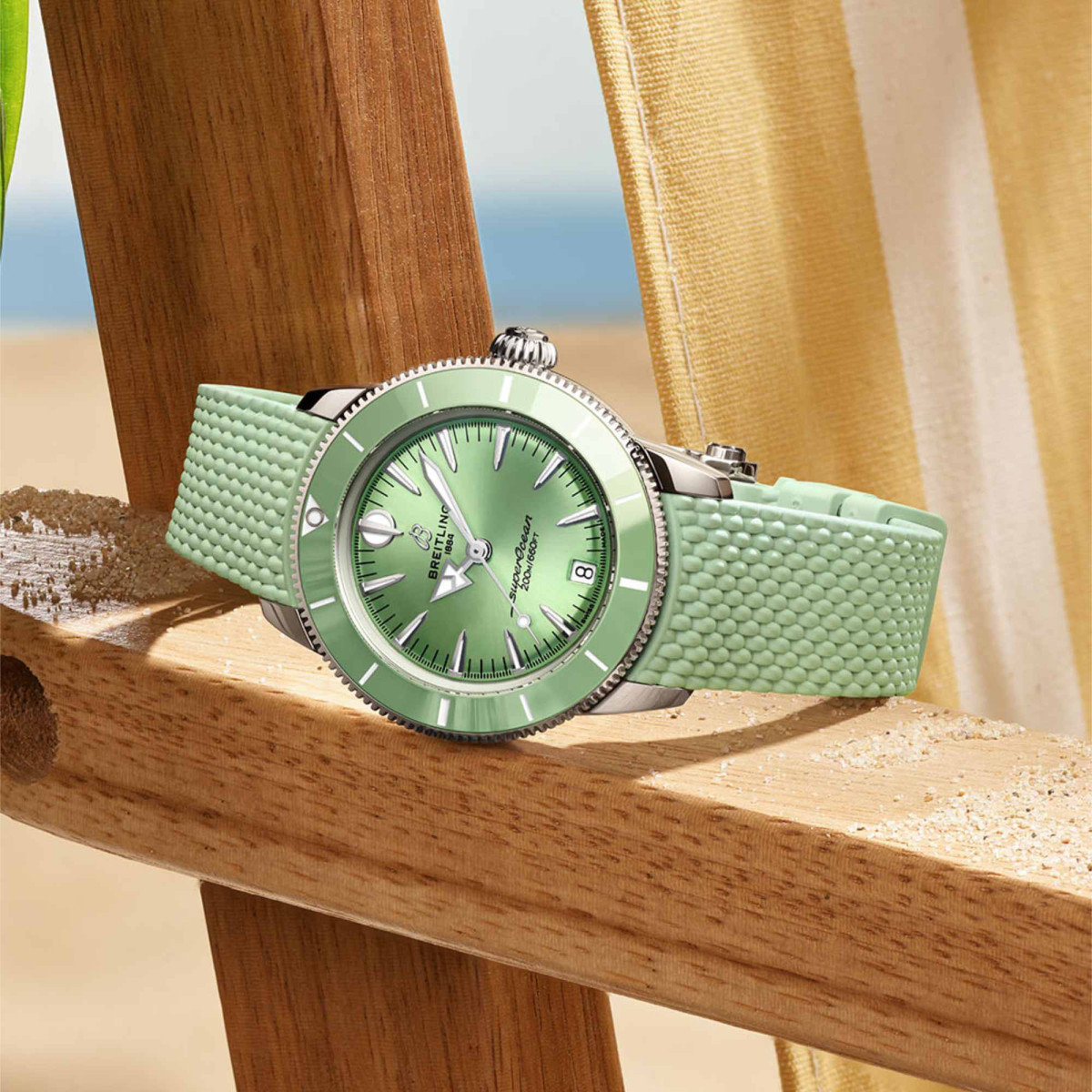 Auch heute noch ist diese Philosophie das Herzstück der Superocean Heritage. Die Seele der 50er Jahre, aber im neuen Kleid für die Gegenwart. Die neueste Superocean Heritage baut auf allem auf, was das Original unverwechselbar gemacht hat, und verfeinert es. Die Kollektion führt das Automatik-Uhrwerk B31 ein, Breitlings erstes exklusives Manufaktur-Kaliber mit drei Zeigern. Eine Lünette mit Keramikeinlage bietet außergewöhnliche Kratzfestigkeit, während die integrierten Armbänder aus Mesh-Metall oder Mesh-Kautschuk eng am Gehäuse anliegen und mit Faltschließen für ein sauberes, wasserdichtes Finish gesichert werden. Ein diskretes Datumsfenster auf sechs Uhr und die originalen Signaturzeiger– Pfeil für die Stunden, Speer für die Minuten – sorgen für Ablesbarkeit und Ausgewogenheit, über oder unter der Oberfläche.