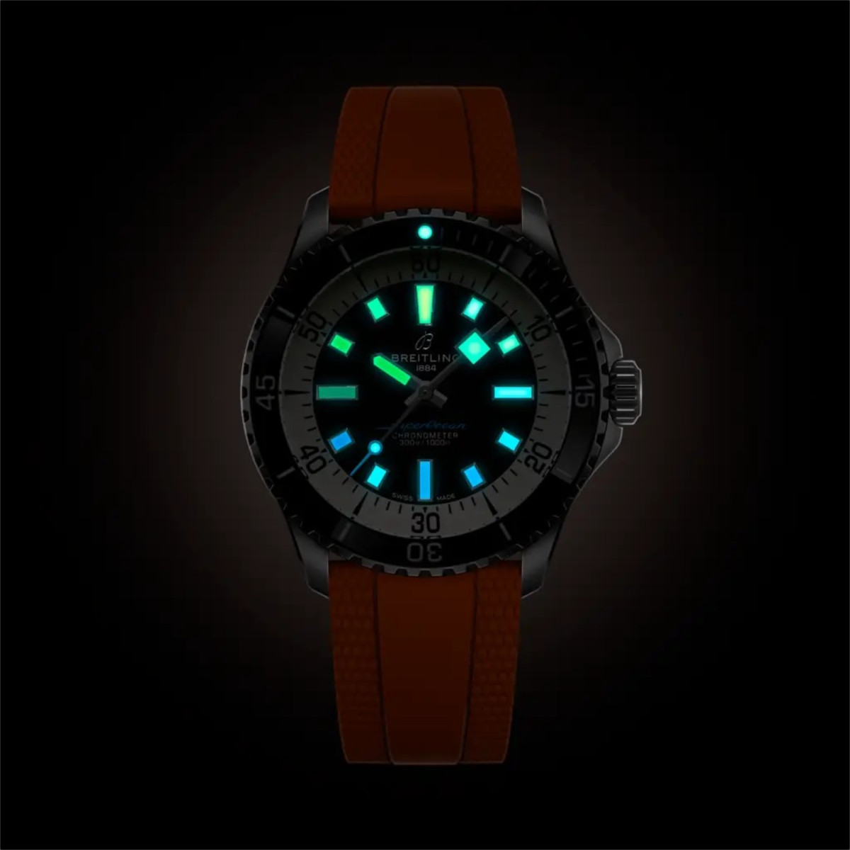 Das Kautschukarmband ist mit einer Faltschliesse versehen, die präzise Einstellungen von bis zu 15 mm ermöglicht und für optimale Passgenauigkeit beim Tragen über Rashguards und Taucheranzügen sorgt. Zur Sicherheit ist die Lünette nur in eine Richtung drehbar. Und das Beste ist: Streng genommen ist sie keine reine Taucheruhr mehr. Surfen, Schwimmen, Drinks an der Strandbar – alles ist möglich. Die Superocean ist die perfekte Balance zwischen nostalgischem Vermächtnis und einem frischen, neuen Look.
