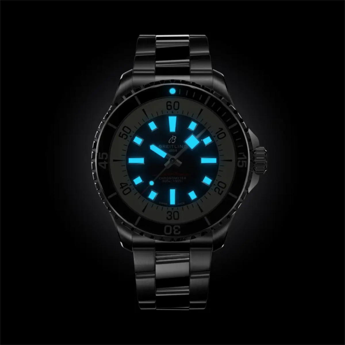 Ref. A17376211C1A1 - Die neue Superocean sieht nicht nur gut aus, sondern ist auch ein technisches Meisterwerk. Sie ist bis 300 m (1000 ft) wasserdicht und verfügt über breite Zeiger und Indizes, die mit Super-LumiNova® beschichtet sind und eine außergewöhnlich gute Ablesbarkeit unter Wasser ermöglichen. Ihre kratzfeste Lünette mit Keramikeinlage verschleißt nicht und bleicht nicht aus. Aus Sicherheitsgründen ist die Lünette bei den meisten Größen nur einseitig drehbar; die bidirektionale Lünette der 46-mm-Uhr ist durch eine patentierte Arretierung gesichert. Darüber hinaus ist diese Uhr stoßfest sowie sand- und salzwasserbeständig. Für das automatische Breitling-Kaliber 17 gilt eine 2-jährige Garantie und das Uhr werk bietet ca. 38 Stunden Gangreserve.