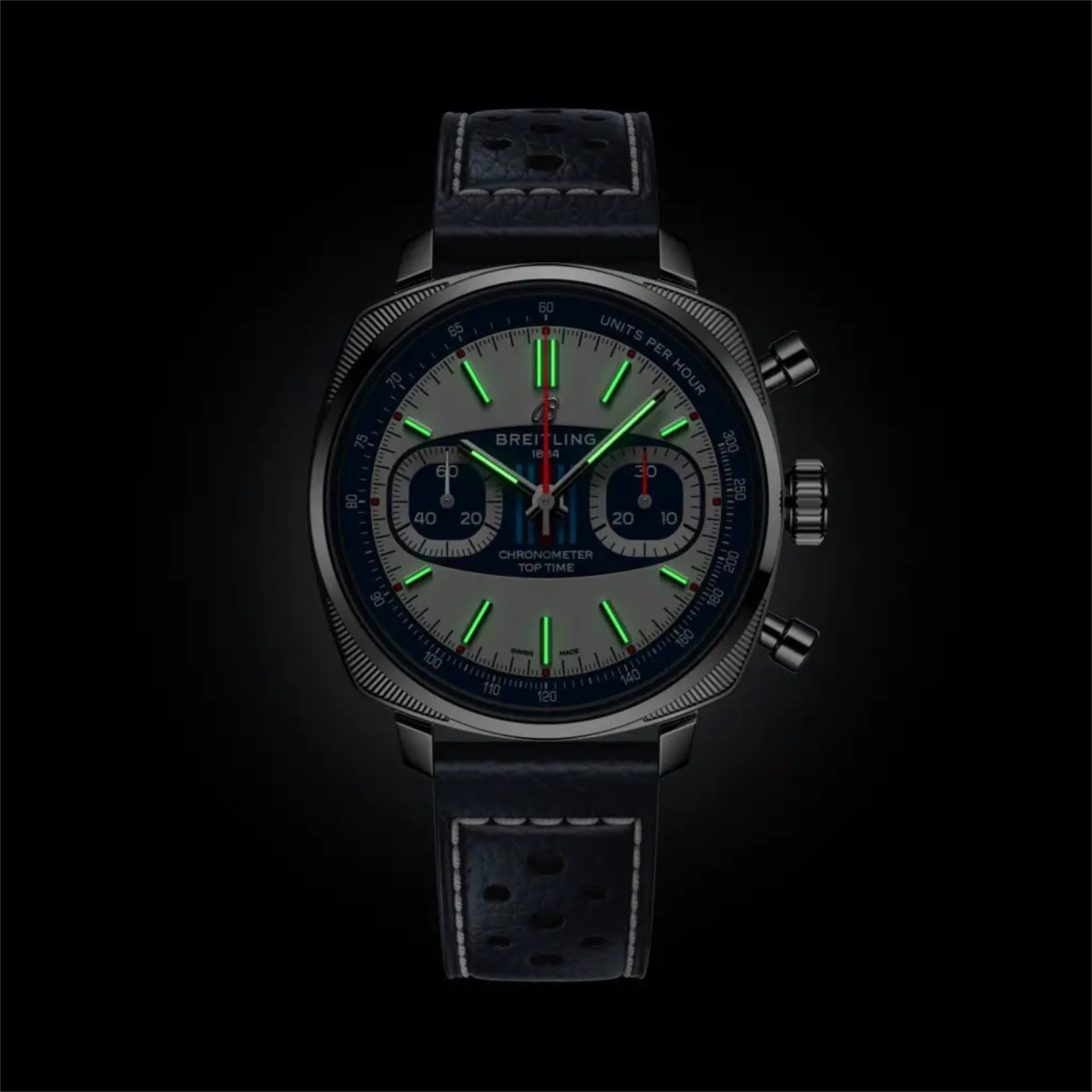 Sie hat eine schlanke Größe von 38 mm und ist mit einem perforierten, dunkelblauen Kalbslederarmband mit Faltschließe ausgestattet. Im Inneren der Uhr schlägt das Breitling-Flaggschiff, das Manufakturkaliber 01 – ein COSC-zertifizierter Chronometer mit einer Gangreserve von 70 Stunden, der für Präzision unter Druck sorgt. Die auf 750 Stück limitierte Top Time Martini Racing verbindet Retro-Ästhetik mit modernem Komfort.