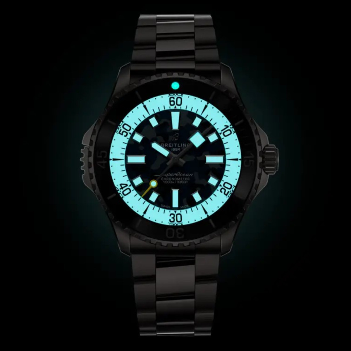 Die Superocean Automatic 46 Super Diver nimmt die gefeierten Designelemente der Slow Motion wieder auf und ergänzt sie mit modernen Funktionen wie einer kratzfesten, matten Keramikinlay-Lünette und Camouflage-Zifferblättern. Breite Zeiger und Indizes in lumineszierenden Super-LumiNova® Farben sorgen für eine gute Ablesbarkeit (und zusätzlichen Spass) unter Wasser. Die Uhr ist wasserdicht bis 1000 Meter (3300 Fuss), stossfest sowie sand- und salzwasserbeständig. Ihr Weicheisen-Innengehäuse schützt gegen Magnetfeldstrahlung, und über eine Sicherungssperre auf der linken Gehäuseseite kann die bidirektionale Drehlünette arretiert werden.