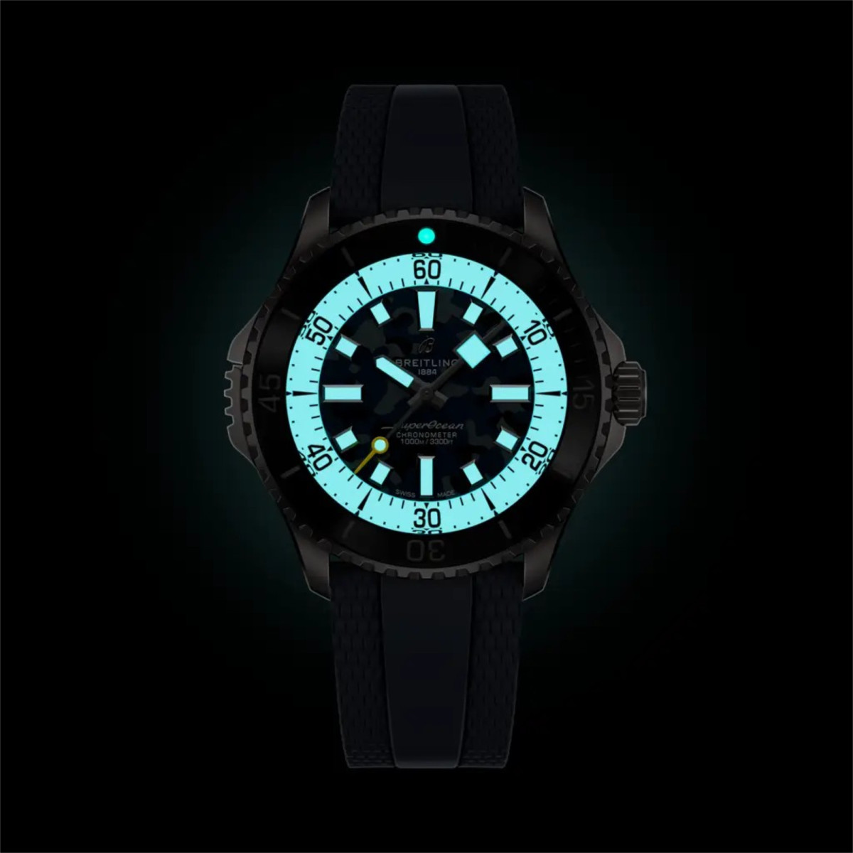 Die Superocean Automatic 46 Super Diver nimmt die gefeierten Designelemente der Slow Motion wieder auf und ergänzt sie mit modernen Funktionen wie einer kratzfesten, matten Keramikinlay-Lünette und Camouflage-Zifferblättern. Breite Zeiger und Indizes in lumineszierenden Super-LumiNova® Farben sorgen für eine gute Ablesbarkeit (und zusätzlichen Spass) unter Wasser. Die Uhr ist wasserdicht bis 1000 Meter (3300 Fuss), stossfest sowie sand- und salzwasserbeständig. Ihr Weicheisen-Innengehäuse schützt gegen Magnetfeldstrahlung, und über eine Sicherungssperre auf der linken Gehäuseseite kann die bidirektionale Drehlünette arretiert werden.
