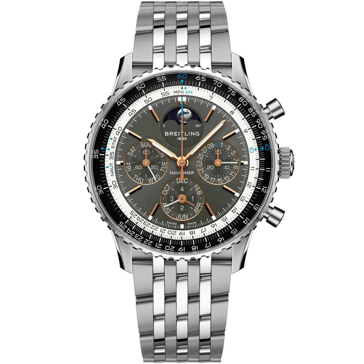 Es handelt sich um das fortschrittlichste Uhrwerk, das jemals in einer Navitimer verbaut wurde, und derzeit um die einzige Automatikuhr mit ewigem Kalender aus der Kernkollektion auf dem Markt. Diese Navitimer ist aus Edelstahl gefertigt und mit einer Lünette aus Platin versehen. Sie zeichnet sich durch ihr anthrazitfarbenes Zifferblatt aus, das die Stille und Tiefe des Weltraums widerspiegelt.