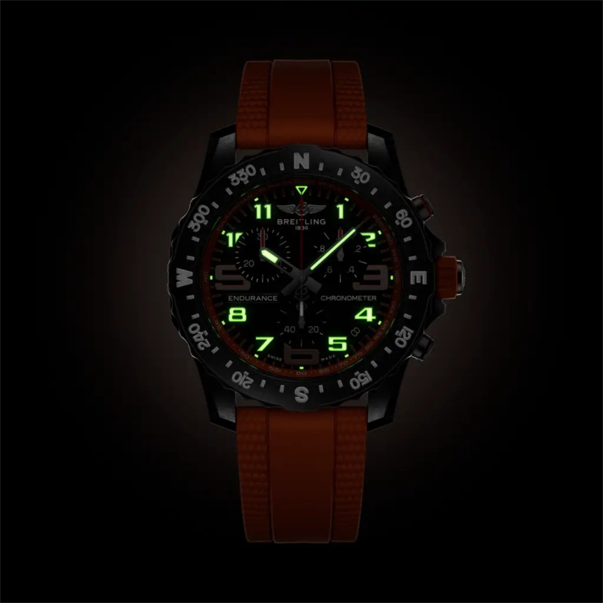 Die Endurance Pro verfügt über ein ultraleichtes Gehäuse aus Breitlight®. Dieser widerstandsfähige Werkstoff ist 3,3-mal leichter als Titan und 5,8-mal leichter als Edelstahl. Das antimagnetische, thermisch stabile und hypoallergene Breitlight® ist hochgradig kratz-, zug- und korrosionsfest. Die haptische Wirkung ist wärmer als die von Metall; der leichte Textureffekt unterstreicht den Einfallsreichtum des Designs. Das Material ist zu 100 % Swiss-made und nur bei Breitling erhältlich. Neben einem Durchmesser von 44 mm oder 38 mm haben Athleten bei der Endurance Pro ausserdem die Wahl zwischen zahlreichen farbenfrohen Zifferblättern und Kautschukarmbändern mit der Breitlight®-Dornschliesse. Beide Grössen werden vom Breitling-Kaliber 82 bzw. 83 angetrieben. Diese COSC-zertifizierten SuperQuartz™-Chronographen zeichnen sich durch eine aussergewöhnliche Ganggenauigkeit aus.
