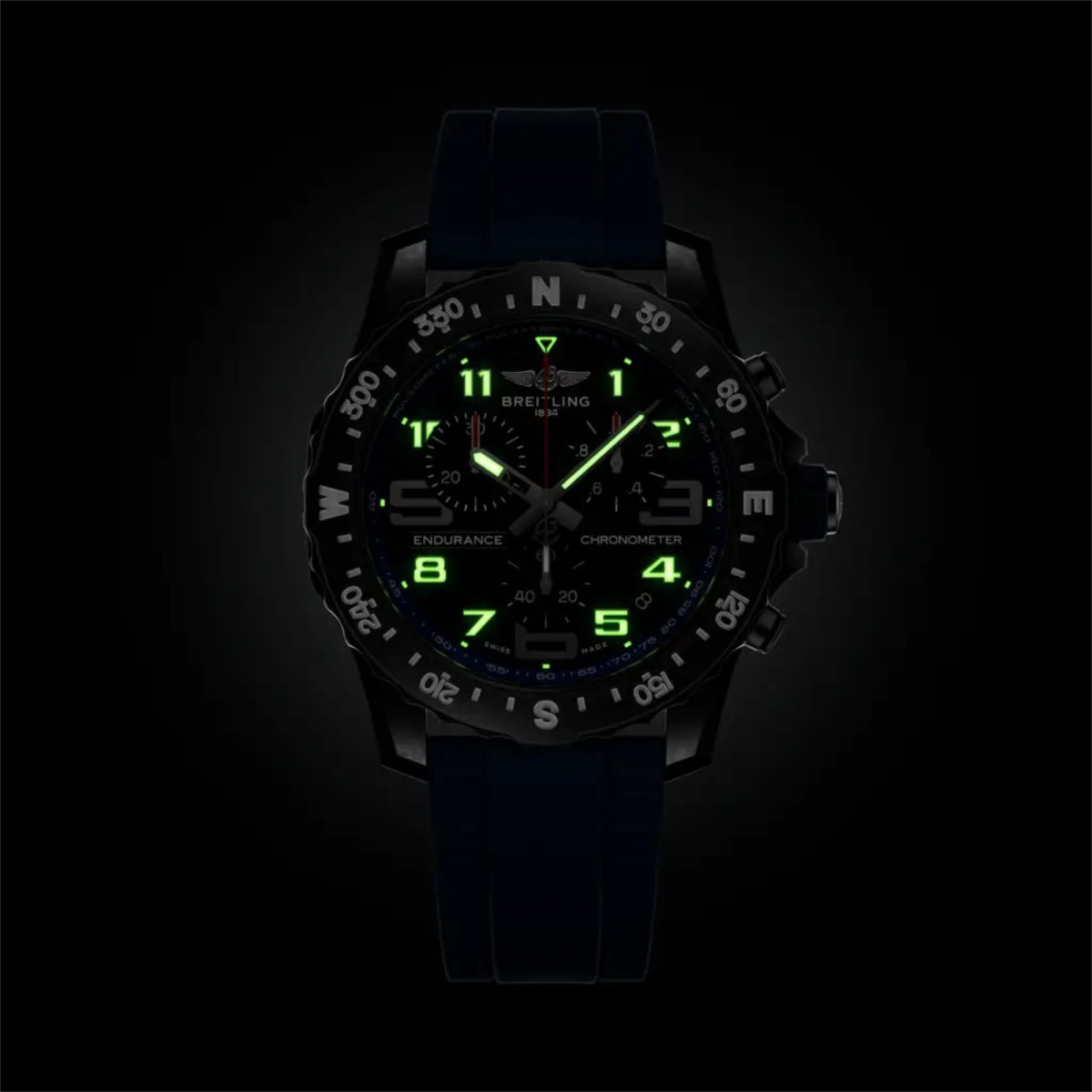 Die Endurance Pro verfügt über ein ultraleichtes Gehäuse aus Breitlight®. Dieser widerstandsfähige Werkstoff ist 3,3-mal leichter als Titan und 5,8-mal leichter als Edelstahl. Das antimagnetische, thermisch stabile und hypoallergene Breitlight® ist hochgradig kratz-, zug- und korrosionsfest. Die haptische Wirkung ist wärmer als die von Metall; der leichte Textureffekt unterstreicht den Einfallsreichtum des Designs. Das Material ist zu 100 % Swiss-made und nur bei Breitling erhältlich. Neben einem Durchmesser von 44 mm oder 38 mm haben Athleten bei der Endurance Pro ausserdem die Wahl zwischen zahlreichen farbenfrohen Zifferblättern und Kautschukarmbändern mit der Breitlight®-Dornschliesse. Beide Grössen werden vom Breitling-Kaliber 82 bzw. 83 angetrieben. Diese COSC-zertifizierten SuperQuartz™-Chronographen zeichnen sich durch eine aussergewöhnliche Ganggenauigkeit aus.