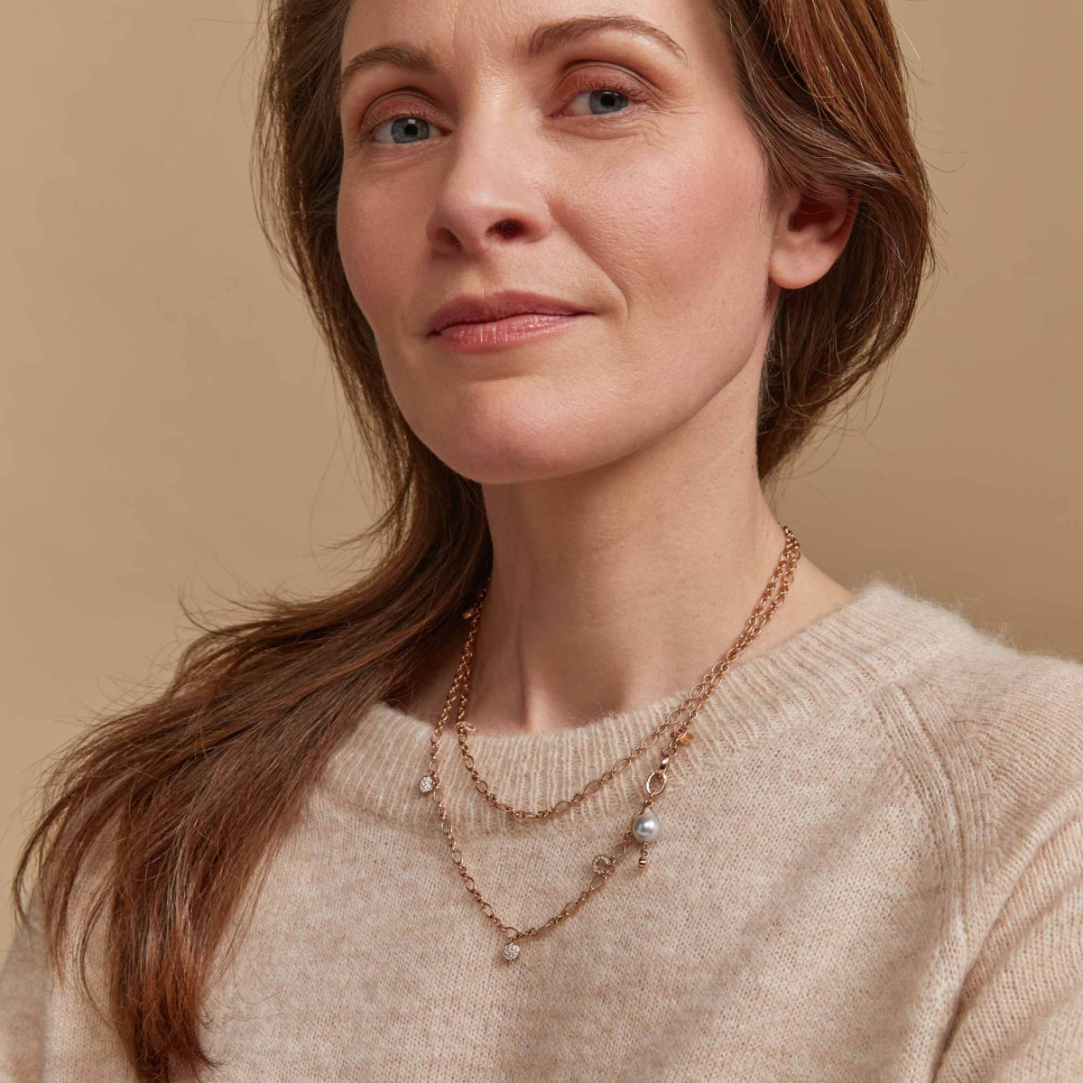Ref. 8CR444490AKB9BR - Vielseitige, unkonventionelle lange Kette mit Diamantbesatz und einer blauen Akoya-Perle. Doppelt gebunden, kann sie lang oder kurz getragen werden.