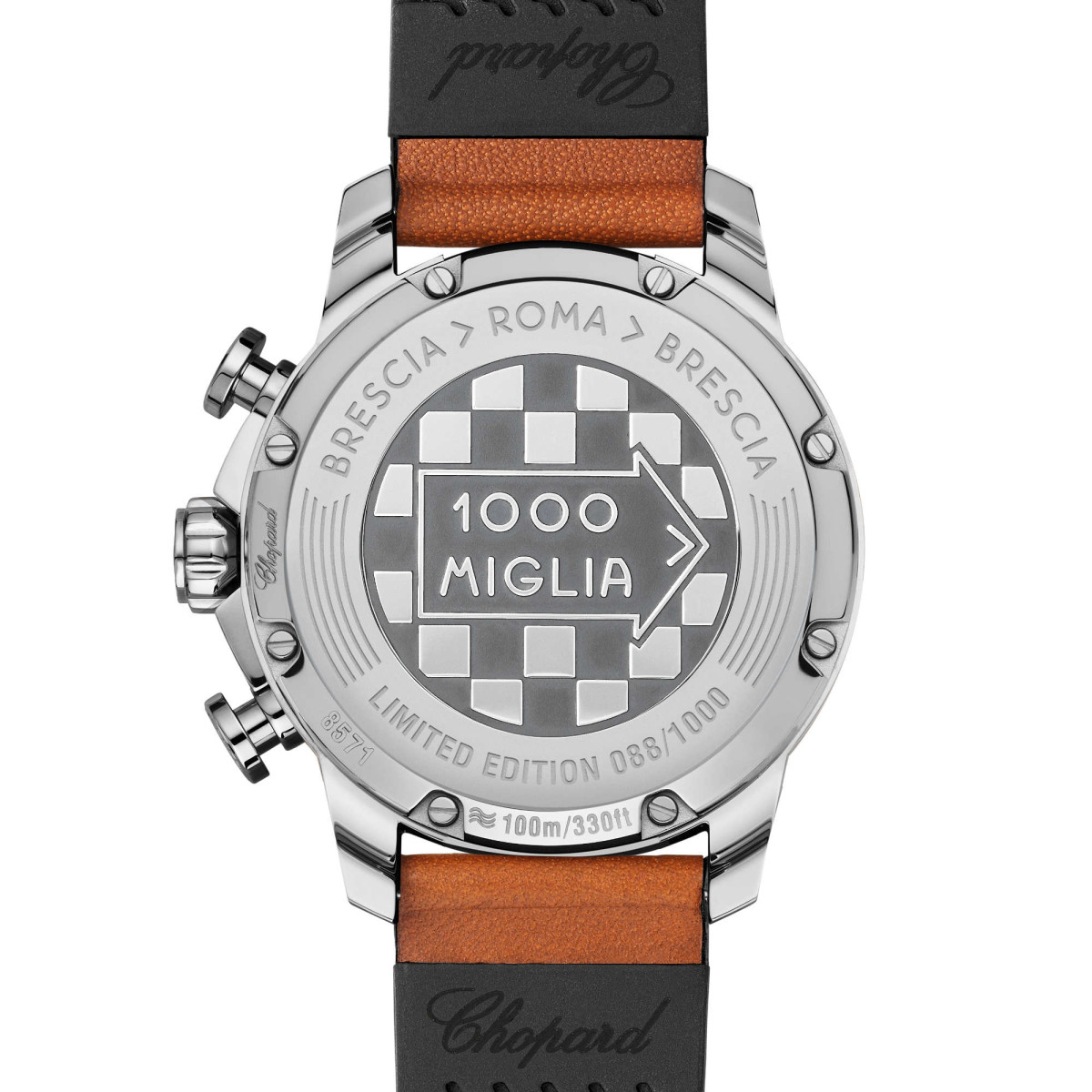 Ref. 168571-3004 - Die Mille Miglia Race Edition bringt die Welt des Autorennens ans Handgelenk. In dem 44 mm grossen Edelstahlgehäuse verbirgt sich ein vom COSC als Chronometer zertifiziertes Chronographenwerk. Dieses zeigt Stunden, Minuten und Datum an. Zudem verfügt es über einen 12-Stunden-Zähler bei 6 Uhr, eine kleine Sekunde bei 9 Uhr sowie einen 30-Minuten-Zähler bei 12 Uhr. Auch ästhetisch hat die Uhr einiges zu bieten. Die Mille Miglia mit ihren markanten roten Details erinnert in vielerlei Hinsicht an Rennwagen: Die Drücker sind von Motorkolben inspiriert, die rutschfesten Oberflächen von Bremspedalen und das Kautschukarmband von Reifenprofilen. Limitierte Auflage von 1000 Stück