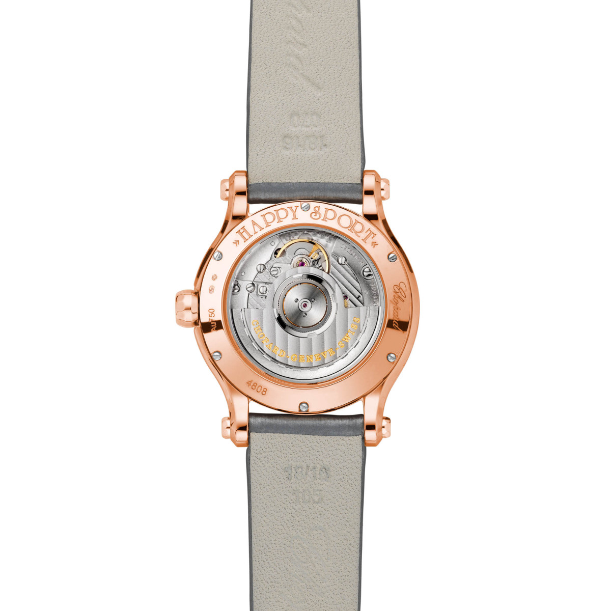 Ref. 274808-5012 - Chic und feminin – die Uhr Happy Sport 36 mm Automatic aus Roségold ist mit einem mechanischen Uhrwerk mit Automatikaufzug und 42 Stunden Gangreserve ausgestattet. Als wahre Ode an die Lebensfreude verfügt dieser neue Zeitmesser mit seinem zierlichen 36-mm-Gehäuse über ein feines elegantes gebürstetes graues Guilloche-Zifferblatt und ein passendes aufgerauhtes graues Stoffarmband. Als stilvolles Sinnbild der Freiheit ist die Happy Sport eine Talismanuhr für freigeistige Damen.
