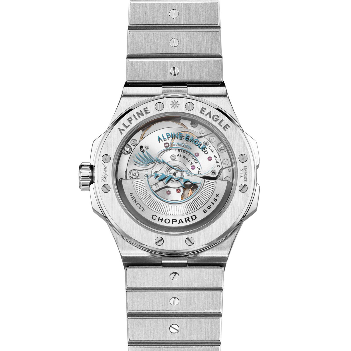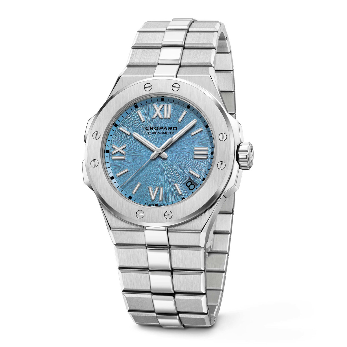 Ref. 298600-3035 - Die sportliche Alpine Eagle Kollektion von Chopard begrüßt ein neues Modell in Lucent Steel™ mit einem Zifferblatt in „Rhone Blue”. Inspiriert von der Schönheit des natürlichen Lebensraums des Adlers verkörpert diese Kreation das Engagement von Chopard zur Unterstützung der Alpine Eagle Foundation. Die Farbe des Zifferblatts erinnert an den ikonischsten Fluss des Alpenmassivs: die Rhone. Die strahlende Struktur des Zifferblatts erinnert an die Iris eines Adlers, während die mit Super LumiNova® beschichteten Zeiger und Stundenmarkierungen eine perfekte Lesbarkeit unter allen Bedingungen gewährleisten.