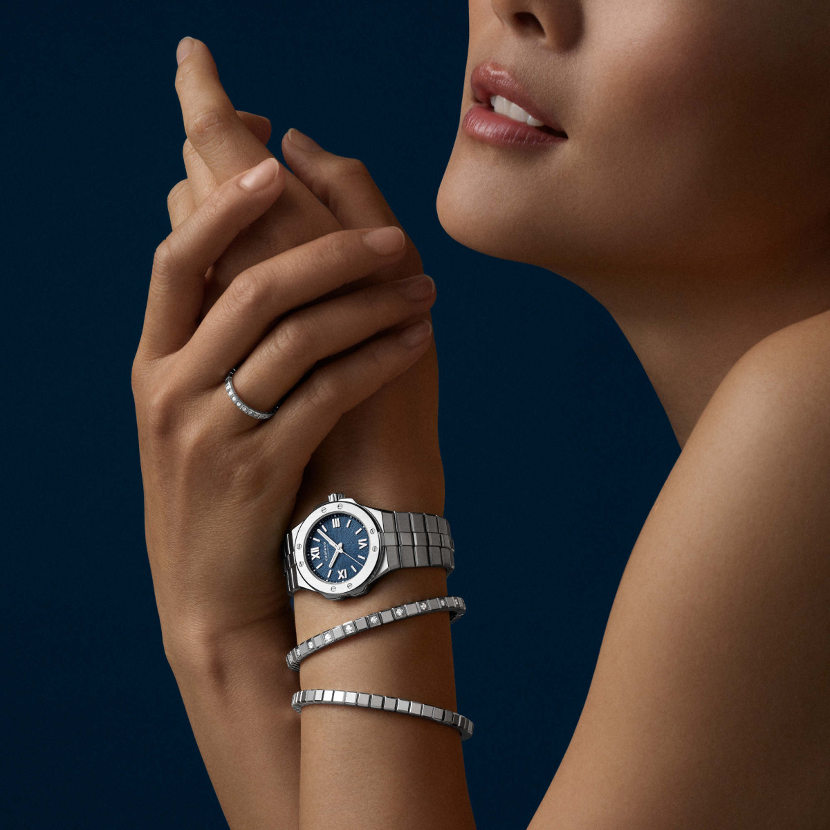 In der galvanisch hergestellten Farbe Aletschblau. Das Finish der Oberfläche ist von dem Auge eines Adlers inspiriert. Mit rhodinierten römischen Ziffern und Indexen.