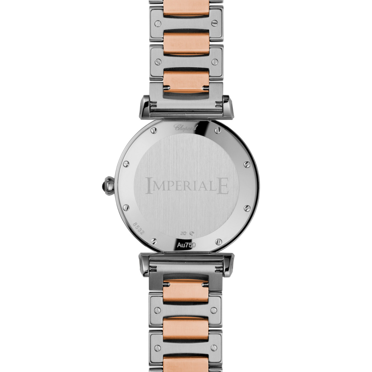 Ref. 388532-6007 - Das ausdrucksstarke Spiel aus Rundungen und geraden Linien dieser IMPERIALE Uhr wird unterstrichen durch einen raffinierten Materialmix. Die interessante Verbindung aus 18-Karat-Roségold und Edelstahl wird zudem durch ein Zifferblatt in sattem Grün ergänzt und sorgt für einen wahrhaft majestätischen Eindruck. Als Höhepunkt der Raffinesse ist die Krone mit Turmalinen verziert.