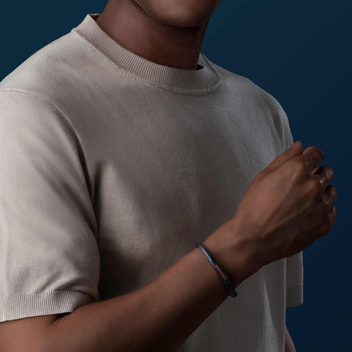 Ref. 95016-0225 - Das Dröhnen der Rennstrecke ist mit dem sportlichen Mille Miglia Armband an Ihrem Handgelenk nie weit entfernt. Es ist ein gekonntes Spiel mit den klassischen Rennwagen-Codes. Der schwarze Kautschuk mit Reifenprofil und die mattschwarze Schließe erhalten durch das rot lackierte Chopard Logo einen dynamisch maskulinen Look.