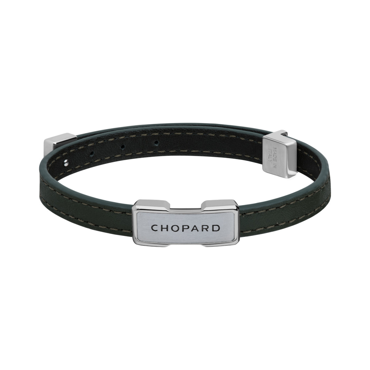 Ref. 95016-0379 - Das Heritage Armband in khakifarbenem Leder mit silberfarbenen Verzierungen ist mit einer Schließe mit einer strukturierten Aussparung versehen, die an das Design der Alpine Eagle Uhr erinnert. Mit dem aufgeprägten ikonischen Chopard Logo bietet es einen modernen, eleganten Look, der Stärke und Selbstverstrauen ausstrahlt. Es lässt sich an jedes Handgelenk anpassen.