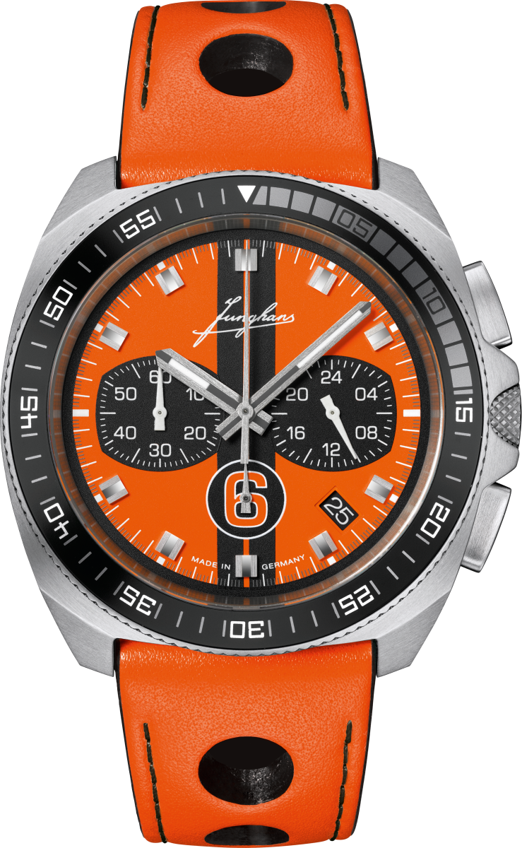 Ref. 41/4560.00 - Die Liebe zum Sport im Allgemeinen und die Sportzeitmessung im Besonderen haben bei Junghans eine lange Tradition. Das begann in den 1920er-Jahren mit den ersten Handstoppuhren und setzte sich mit der Zeitmessung vielzähliger Sportwettkämpfe fort, deren Höhepunkt 1972 in München war. Die limitiere 1972 Chronoscope Sports Edition 2026 trägt einen markanten Doppelstreifen, den historischen Junghans-Schriftzug sowie die Ziffer 6 in Form einer Startnummer. Das Modell ist auf 200 Uhren limitiert.