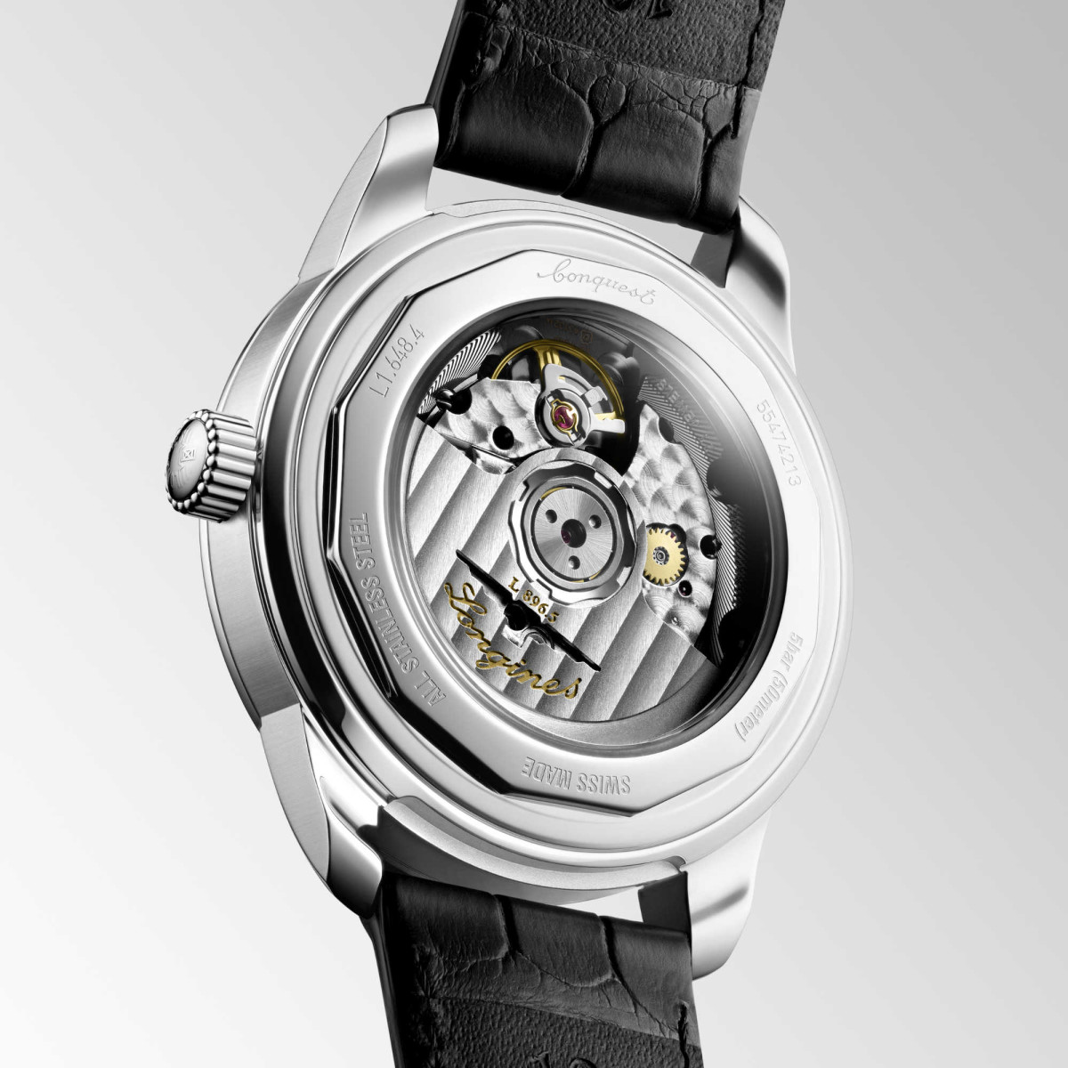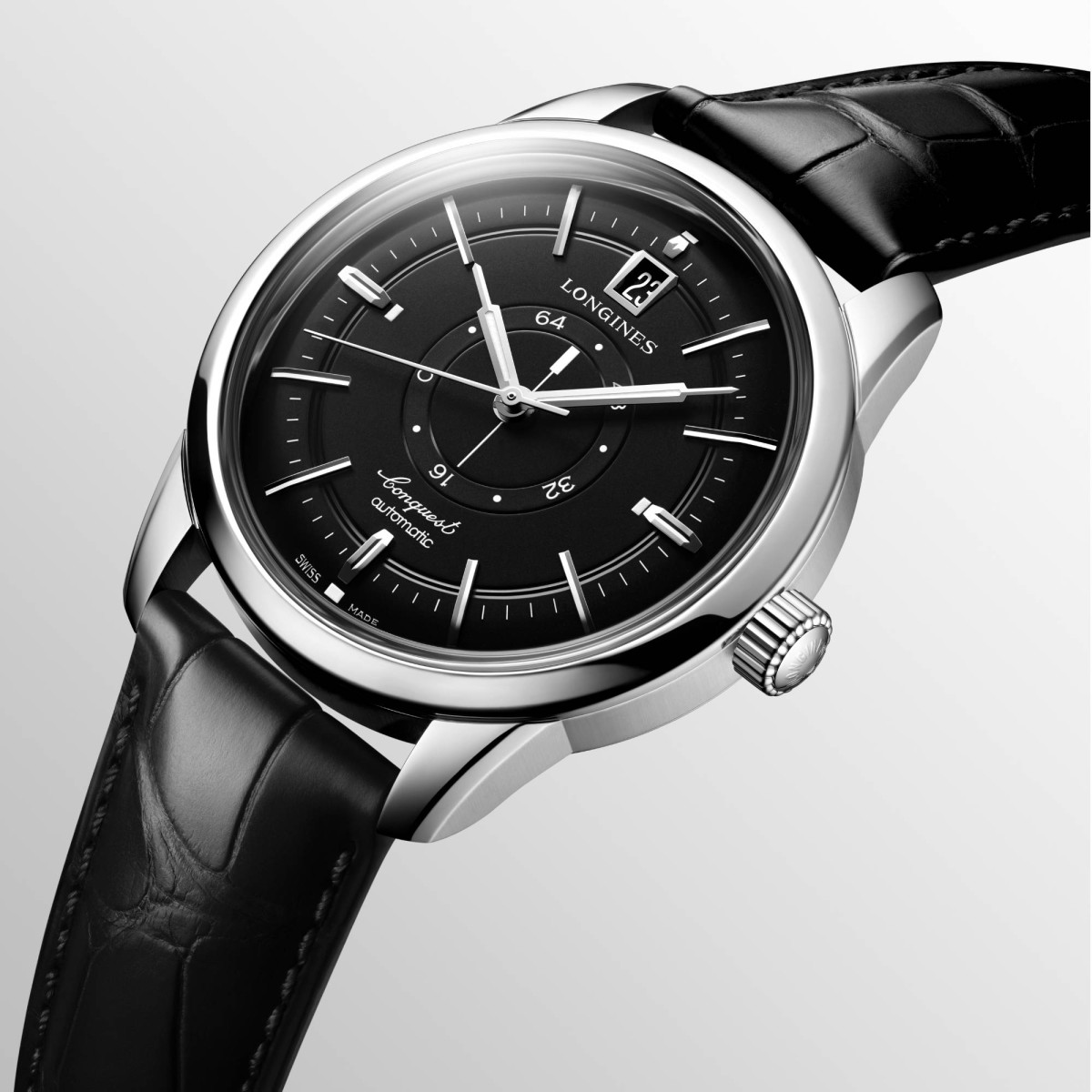 Ref. L1.648.4.52.2 - Longines präsentiert die neue CONQUEST HERITAGE CENTRAL POWER RESERVE mit einem Gehäuse von 38 mm Durchmesser. Mechanisches Uhrwerk mit automatischem Aufzug, exklusives Longines Kaliber L896.5 mit Gangreserve auf rotierenden Scheiben in der Mitte des Zifferblatts. Ein ikonisches Modell mit schwarzem Zifferblatt und integriertem schwarzen Alligatorlederarmband anlässlich des 70-jährigen Jubiläums der Kollektion Conquest.
