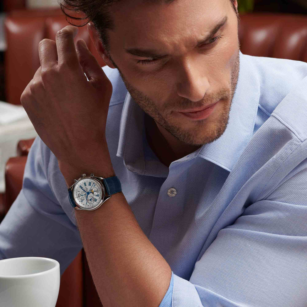Chronograph: Zentraler 60-Sekunden-Zeiger, Mondphasenanzeige mit 12-Stunden-Zähler bei 6 Uhr, 30-Minuten-Zähler mit Wochentag- und Monatsanzeige bei 12 Uhr