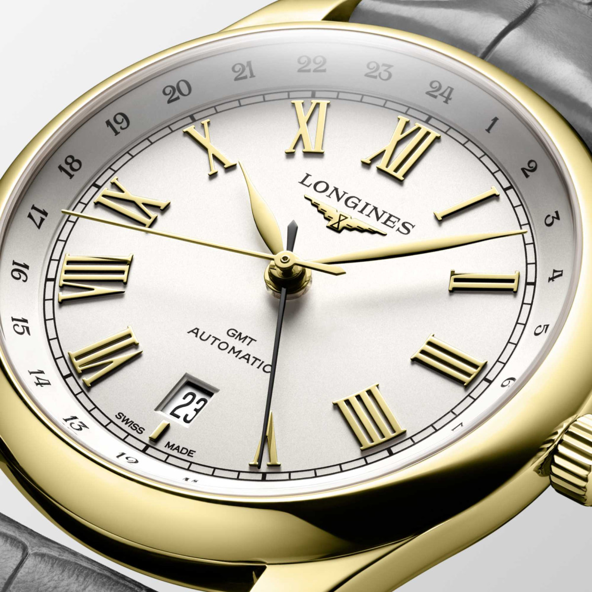 Ref. L2.844.6.71.2 - The Longines Master Collection verkörpert perfekt das uhrmacherische Savoir-faire und die zeitlose Eleganz der Marke mit der geflügelten Sanduhr. Heutewird diese zentrale Linie um zwei neue, exklusive GMT-Modelle aus 18 Karat Gelbgold oder 18 Karat Roségold erweitert, die jeweils auf 500 Stück limitiert sind.Dieses Modell wird von dem Longines exklusiven Kaliber L.844.5 angetrieben, das mit einer Siliziumspiralfeder und anderen neuartigen Komponenten versehen. Sie gewährleisten eine Magnetfeldresistenz, welche die Anforderungen der ISO 764 um das Zehnfache übersteigt. Das mechanische Uhrwerk mit Automatikaufzug ist durch den transparenten Saphirglasboden des Gehäuses mit 40 mm Durchmesser zu sehen und bietet eine Gangreserve von bis zu 72 Stunden.Das gefrostete silberne Zifferblatt ziert eine 24- Stunden-Skala mit aufgedruckten arabischen Ziffern, eine Eisenbahnminuterie, elf goldene applizierte römische Ziffern und ein Datumsfenster bei 6 Uhr. Vergoldete Blattzeiger zeigen die Zeit an, während der schwarze GMT-Zeiger den Farbton der 24- Stunden-Skala aufgreift. Dieses Modell von The Longines Master Collection GMT wird an einem anthrazitgrauen Lederarmband mit Dornschliesse aus Gelbgold getragen.
