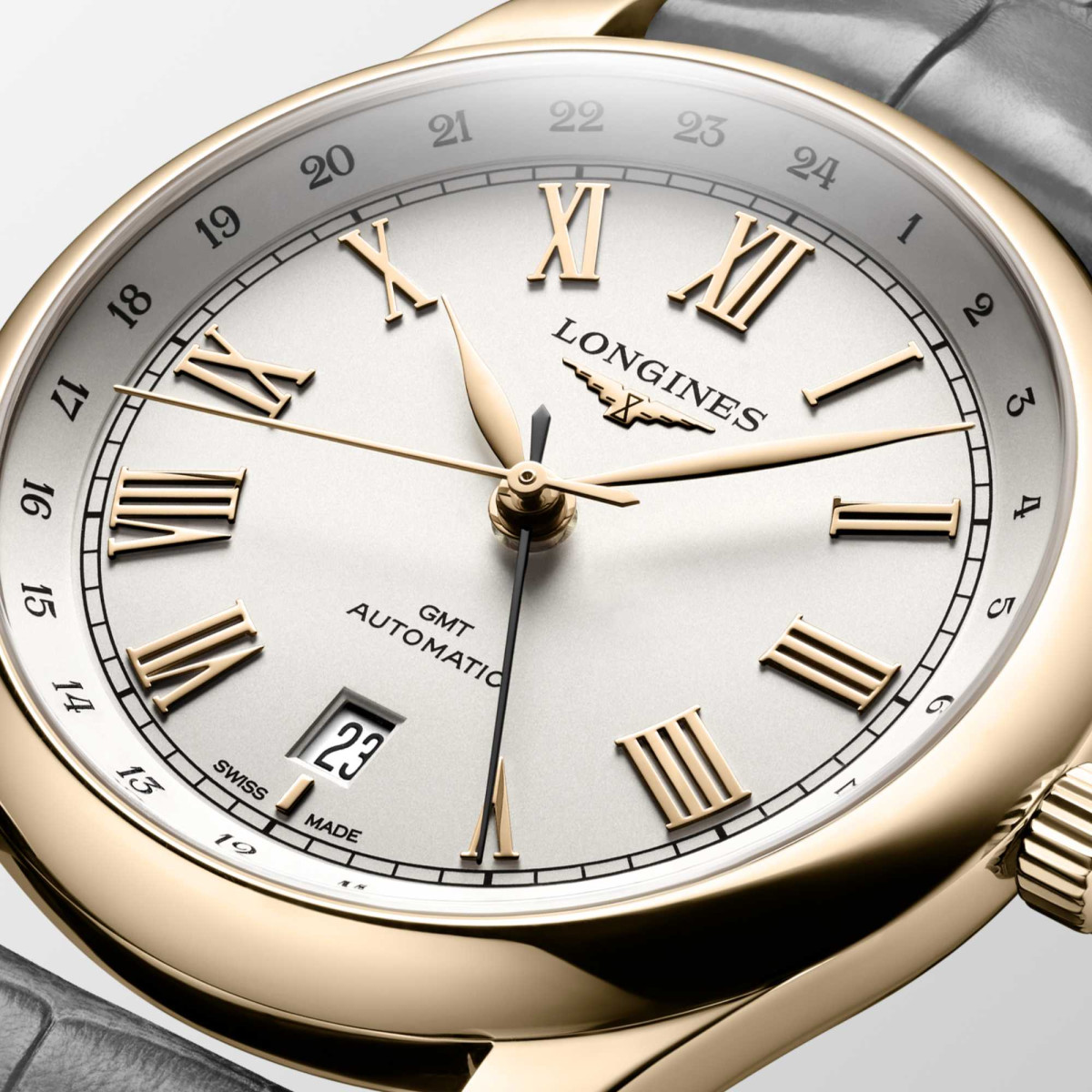 Ref. L2.844.8.71.2 - The Longines Master Collection verkörpert perfekt das uhrmacherische Savoir-faire und die zeitlose Eleganz der Marke mit der geflügelten Sanduhr. Heute wird diese zentrale Linie um zwei neue, exklusive GMT-Modelle aus 18 Karat Gelbgold oder 18 Karat Roségold erweitert, die jeweils auf 500 Stück limitiert sind.Dieses Modell wird von dem Longines exklusiven Kaliber L.844.5 angetrieben, das mit einer Siliziumspiralfeder und anderen neuartigen Komponenten versehen. Sie gewährleisten eine Magnetfeldresistenz, welche die Anforderungen der ISO 764 um das Zehnfache übersteigt. Das mechanische Uhrwerk mit Automatikaufzug ist durch den transparenten Saphirglasboden des Gehäuses mit 40 mm Durchmesser zu sehen und bietet eine Gangreserve von bis zu 72 Stunden.Das gefrostete silberne Zifferblatt ziert eine 24- Stunden-Skala mit aufgedruckten arabischen Ziffern, eine Eisenbahnminuterie, elf goldene applizierterömische Ziffern und ein Datumsfenster bei 6 Uhr. Vergoldete Blattzeiger zeigen die Zeit an, während der schwarze GMT-Zeiger den Farbton der 24- Stunden-Skala aufgreift. Dieses Modell von The Longines Master Collection GMT wird an einem anthrazitgrauen Lederarmband mit Dornschliesse aus Roségold getragen.
