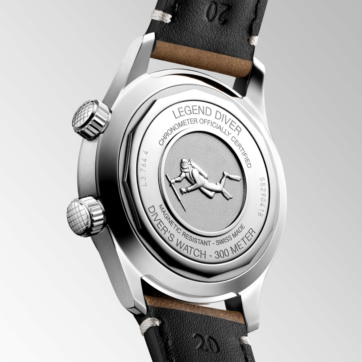 Ref. L3.764.4.50.0 - Die Uhr ist sofort erkennbar an den beiden Kronen und der inneren drehbaren Lünette. Die neue LONGINES LEGEND DIVER taucht mit einem Durchmesser von 39 mm wieder auf, getreu dem Originalmodell von 1959, von dem sie inspiriert wurde. Das als Taucheruhr zertifizierte Modell ist bis zu 30 bar / 300 Meter wasserdicht und wird von einem exklusiven Kaliber L888.6 von Longines angetrieben, das gegen Magnetismus resistent und mit einer Unruhspiralfeder aus Silizium ausgestattet ist. Dieses Uhrwerk hat eine Gangreserve von bis zu 72 Stunden. Die gesamte Uhr ist von der COSC als Chronometer zertifiziert. Die Stunden werden durch verlängerte Indizes und erhöhten arabische Leuchtziffern angezeigt. Die rhodinierten und polierten Pfeilzeiger, die mit Super LumiNova® beschichtet sind, markieren die Zeit mit optimaler Sichtbarkeit unter allen Umständen. Das Symbol der Kollektion, ein Taucher, ist auf dem perfekt abgewinkelten, verschraubten Gehäuseboden der Uhr eingeprägt. Dieses Modell mit schwarzem Zifferblatt wird an einem braunen Lederarmband mit einer Zungenschließe aus Edelstahl präsentiert.