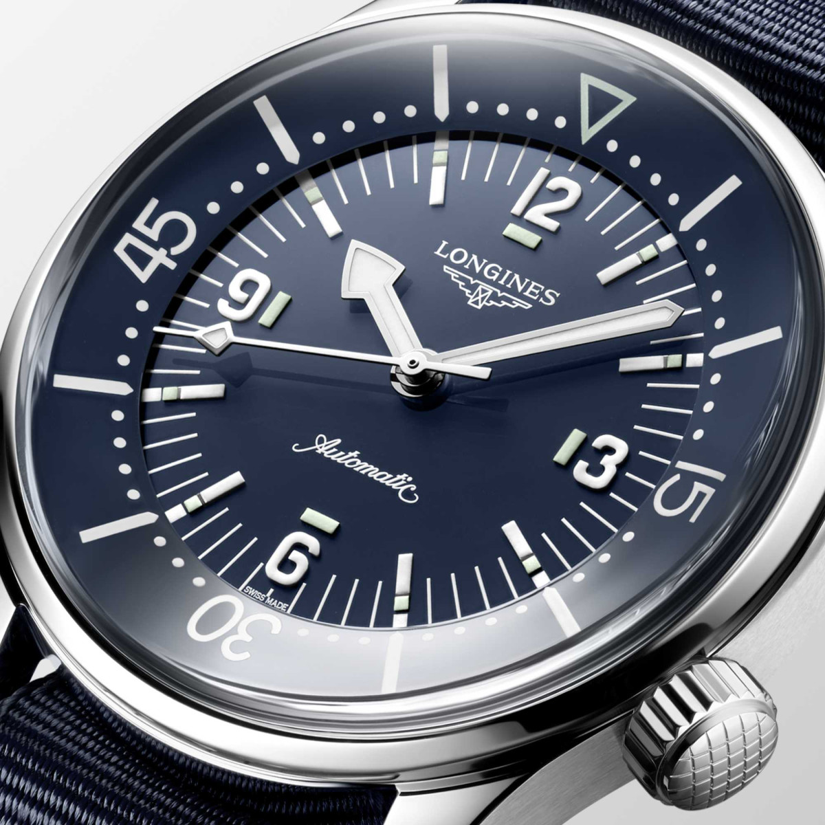 Ref. L3.764.4.90.2 - Die Uhr ist sofort erkennbar an den beiden Kronen und der inneren drehbaren Lünette. Die neue LONGINES LEGEND DIVER taucht mit einem Durchmesser von 39 mm wieder auf, getreu dem Originalmodell von 1959, von dem sie inspiriert wurde. Das als Taucheruhr zertifizierte Modell ist bis zu 30 bar / 300 Meter wasserdicht und wird von einem exklusiven Kaliber L888.6 von Longines angetrieben, das gegen Magnetismus resistent und mit einer Unruhspiralfeder aus Silizium ausgestattet ist. Dieses Uhrwerk hat eine Gangreserve von bis zu 72 Stunden. Die gesamte Uhr ist von der COSC als Chronometer zertifiziert. Die Stunden werden durch verlängerte Indizes und erhöhten arabische Leuchtziffern angezeigt. Die rhodinierten und polierten Pfeilzeiger, die mit Super LumiNova® beschichtet sind, markieren die Zeit mit optimaler Sichtbarkeit unter allen Umständen. Das Symbol der Kollektion, ein Taucher, ist auf dem perfekt abgewinkelten, verschraubten Gehäuseboden der Uhr eingeprägt. Dieses Modell mit blauem Zifferblatt wird mit einem blauen NATO-Armband präsentiert.