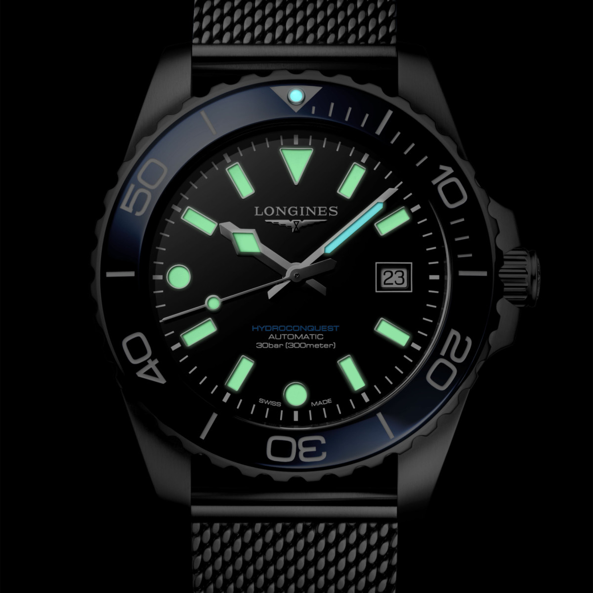 Ein schwarz lackiertes, poliertes Zifferblatt, eine einseitig drehbare Lünette in leuchtendem Blau mit Keramikeinsatz, mit Super-LumiNova® beschichtete Indizes und Zeiger sowie eine Kapsel bei der „0“-Position, eine Wasserdichtigkeit bis 30 bar (300 Meter), eine verschraubte Krone sowie ein verschraubter Gehäuseboden gehören zu den charakteristischen Merkmalen dieses Modells. Ergänzt wird es durch ein Milanese-Mesh-Armband aus Edelstahl, ausgestattet mit einer Doppel-Sicherheitsfaltschließe und Feinjustierung.