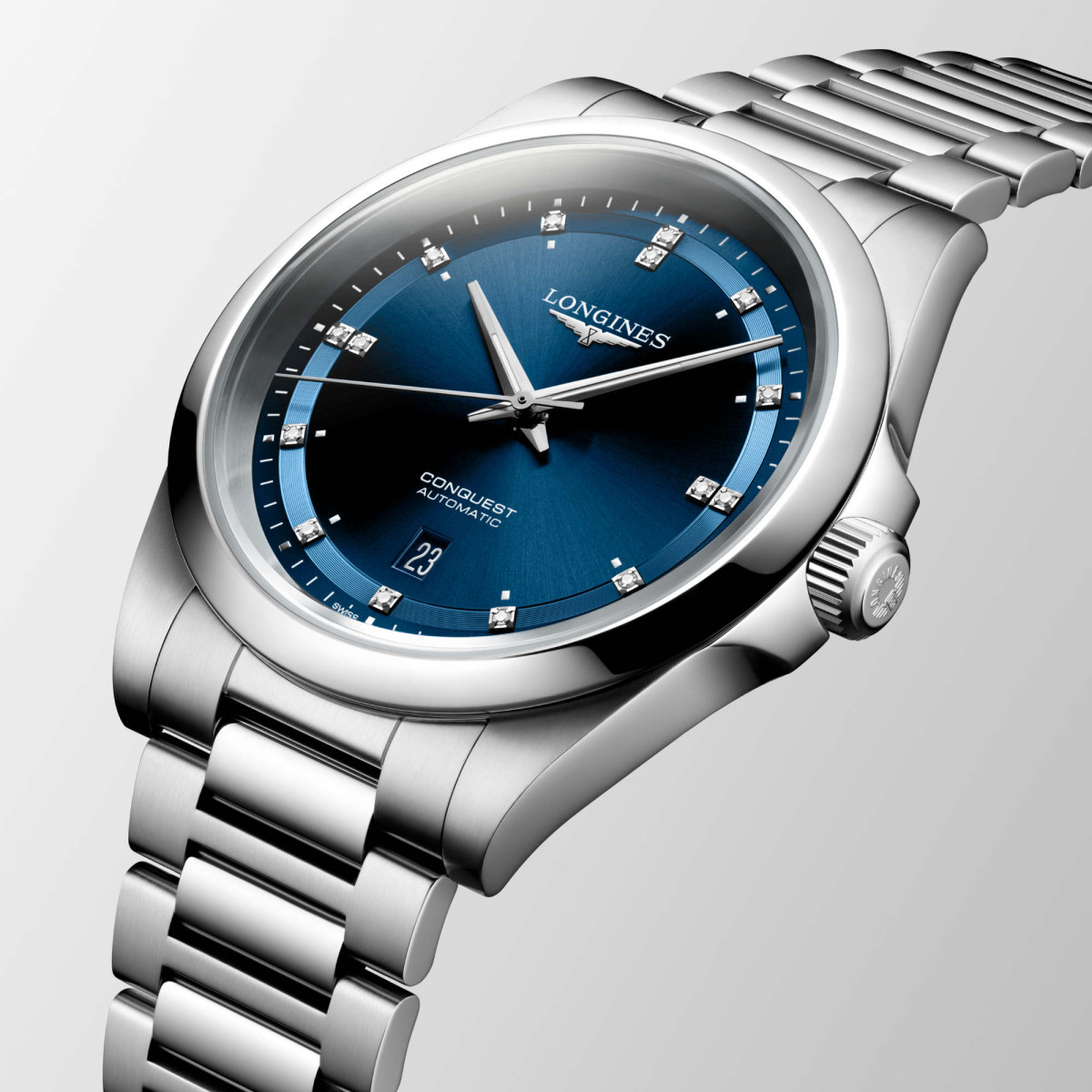 Ref. L3.830.4.97.6 - Die Conquest, die ultimative Uhr für jeden Tag, war auch die erste LONGINES Kollektion, deren Name 1954 durch das Eidgenössische Institut für Geistiges Eigentum geschützt wurde. Seitdem hat sich die Kollektion durch Design und Technologie weiterentwickelt, ist aber ihrer ursprünglichen Identität treu geblieben und strahlt eine harmonische Mischung aus Kühnheit, zeitgenössischem Design und sportlicher Eleganz aus. Jede Conquest Uhr zeigt das unermüdliche Engagement von LONGINES für Leistung und uhrmacherische Exzellenz. Mit ihrem vielseitigen Angebot steht die Reihe Conquest für das Engagement von LONGINES, Uhren für jede Facette des Lebens zu kreieren. Die Kollektion ist in einer Reihe von Größen, Materialien und Farben erhältlich.