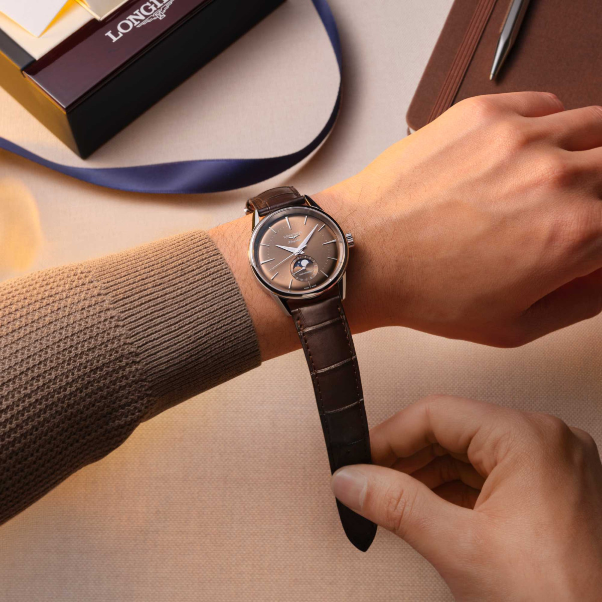 Ref. L4.815.4.62.2 - Die Flagship Heritage Linie wird um neue Varianten mit Mondphasenkomplikation erweitert. Sie befindet sich auf einem Hilfszifferblatt mit Zeigerdatum, das bei 6 Uhr platziert ist. Ihr Uhrwerk, das exklusiv bei Longines zum Einsatz kommt, ist magnetresistent und mit einer Spiralfeder aus Silizium ausgestattet. Das Edelstahlgehäuse mit verschraubtem Boden hat einen Durchmesser von 38.5 mm. Es ist satiniert und gebürstet, mit verkürzten und abgeschrägten Bandanstössen. Dieses Modell mit dem Sunray beige Zifferblatt und mit elf aufgesetzten Indizes und Versilbert polierten Zeigern versehen. Es ist mit einem braunen Lederarmband mit einer neuen Heritage-Dornschliesse bestückt.