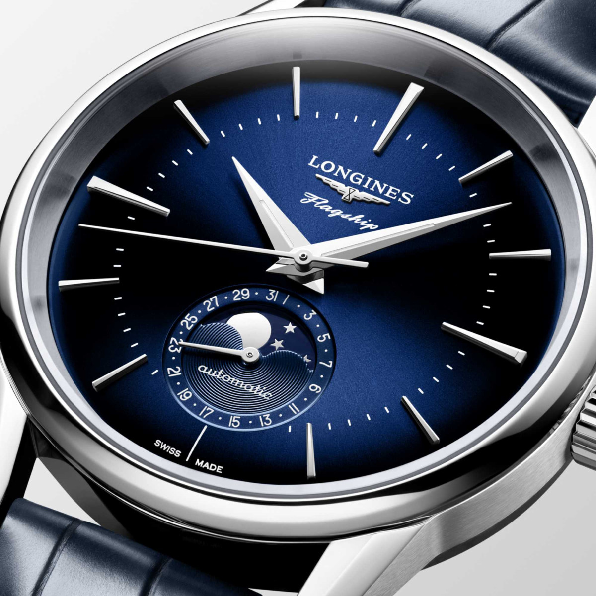 Ref. L4.815.4.92.2 - Die Flagship Heritage Linie wird um neue Varianten mit Mondphasenkomplikation erweitert. Sie befindet sich auf einem Hilfszifferblatt mit Zeigerdatum, das bei 6 Uhr platziert ist. Ihr Uhrwerk, das exklusiv bei Longines zum Einsatz kommt, ist magnetresistent und mit einer Spiralfeder aus Silizium ausgestattet. Das Edelstahlgehäuse mit verschraubtem Boden hat einen Durchmesser von 38.5 mm. Es ist satiniert und gebürstet, mit verkürzten und abgeschrägten Bandanstössen. Dieses Modell mit dem gewölbten blauen Zifferblatt mit Sonnenschliff ist mit elf applizierten Indizes und rhodinierten Zeigern versehen. Es ist mit einem blauen Lederarmband mit einer neuen Heritage-Dornschliesse bestückt.