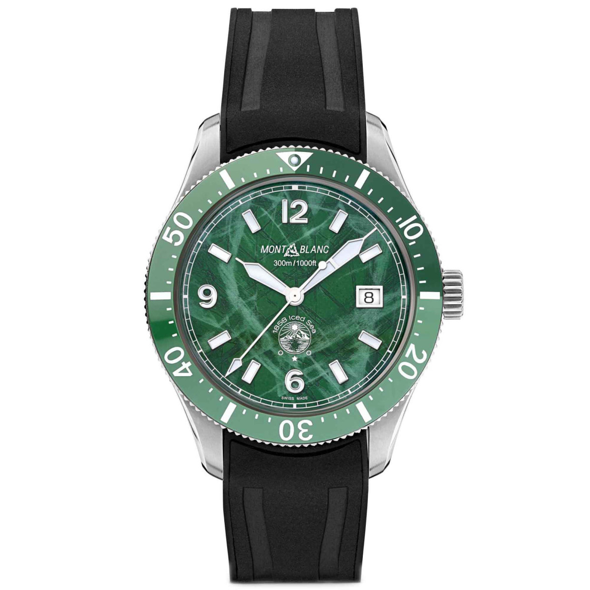 Ref. MB129765 - Als erste Taucheruhr von Montblanc verfügt die Montblanc 1858 Iced Sea Automatic Date über ein Zifferblatt mit Eisbergmotiv, das den Eindruck vermittelt, als blicke man in die Tiefen eines Gletschers. Das grüne Eisbergmuster ist von Mer de Glace inspiriert, diem Hauptgletscher des Mont Blanc Massivs. Seine Textur wurde mithilfe einer nahezu in Vergessenheit geratenen Technik erhalten, dem „gratté-boisé“. Die Uhr verfügt über eine einseitig drehbare, zweifarbige Keramiklünette, einen gravierten Gehäuseboden und ein austauschbares schwarzes Kautschukarmband mit einem raffinierten Einstellungssystem. Die Uhr erfüllt die Anforderungen der ISO 6425 Norm für Taucheruhren und ist wasserdicht bis 300 Meter.