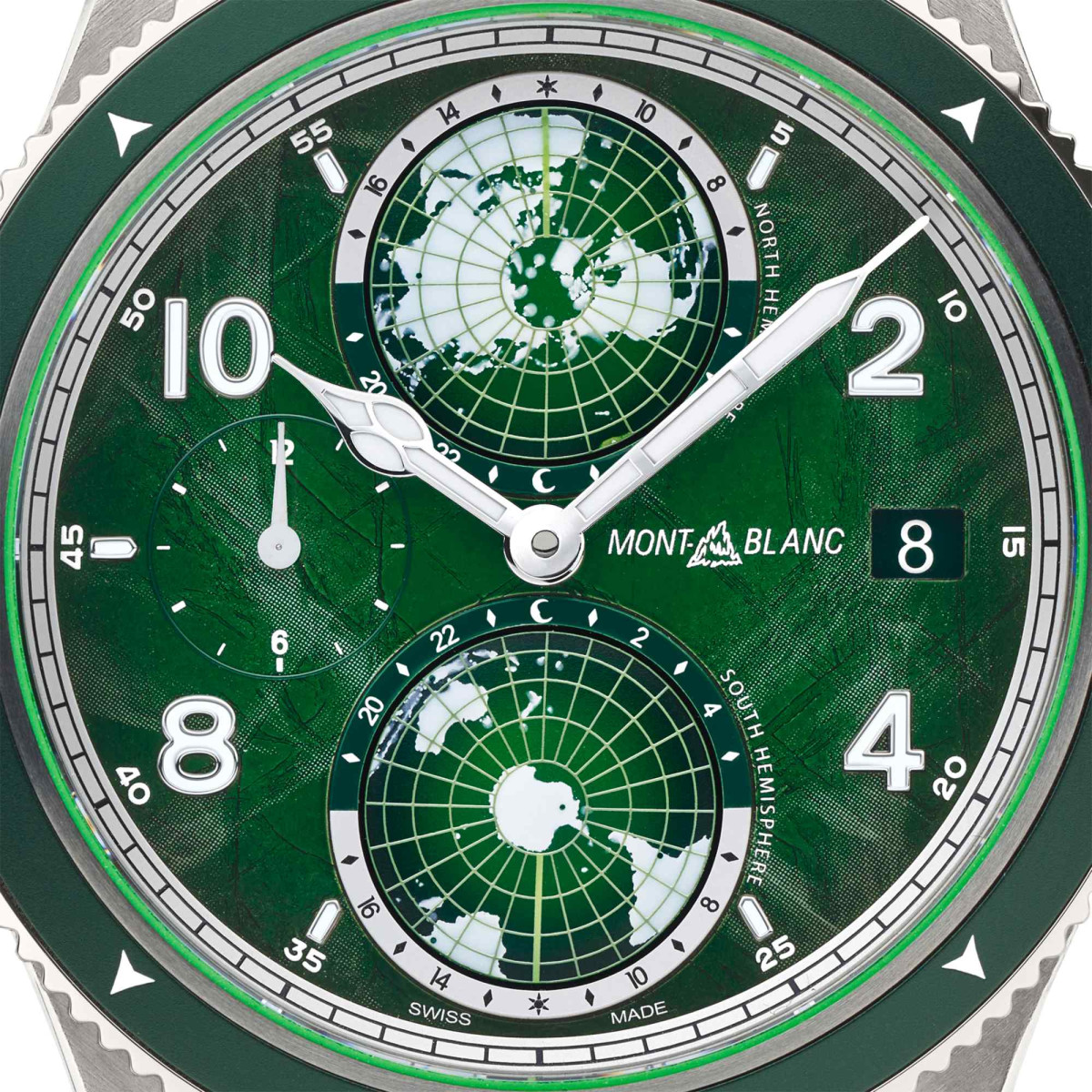Ref. MB133303 - Das Zifferblatt mit dem Gletschermuster in Sfumato-Grün der Montblanc 1858 Geosphere 0 Oxygen, das das Abenteuer Bergsteigen zum Ausdruck bringt, ist von der tiefgrünen Farbe des Jadebergs inspiriert. Die Uhr verfügt über ein 42-mm-Edelstahlgehäuse, das komplett sauerstofffrei ist. Es ist mit einer geriffelten beidseitig drehbaren Lünette aus grünem eloxiertem Aluminium versehen, auf der die vier Himmelsrichtungen mit Leuchtbeschichtung zu sehen sind. Angetrieben wird die Uhr vom MB 29.25 Automatikkaliber mit der Montblanc Weltzeitkomplikation, zu der die drehbaren nördlichen und südlichen Halbkugeln, eine 24-Stundenskala, Tag-/Nachtanzeigen, eine zweite Zeitzone und eine Datumsanzeige gehören. Abgerundet wird die Kreation von einer farbigen 3D-Lasergravur des Mont Blanc auf dem Gehäuseboden sowie von einem schmal zulaufenden austauschbaren Stahlarmband mit Feineinstellung.