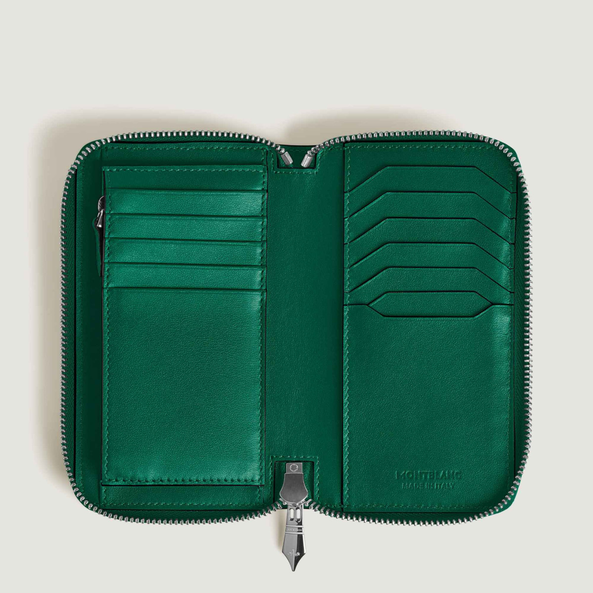 Ref. MB220331 - Diese Brieftasche vereint elegantes Design mit praktischer Funktionalität und ist ein vielseitiger Begleiter für jede Gelegenheit. Das Modell ist aus hochwertigem, weichem Kalbsleder in Malachit gefertigt und besticht durch seine klare, rechteckige Silhouette, die Eleganz ausstrahlt. Ein von einer Feder inspirierter Reißverschlussschieber gibt beim Öffnen den Blick frei auf drei Geldscheinfächer, ein Münzfach mit Reißverschluss, drei Fächer für kleinere Utensilien und Schlitze für bis zu 12 Kreditkarten, die für mühelose Organisation und raffinierten Stil sorgen.