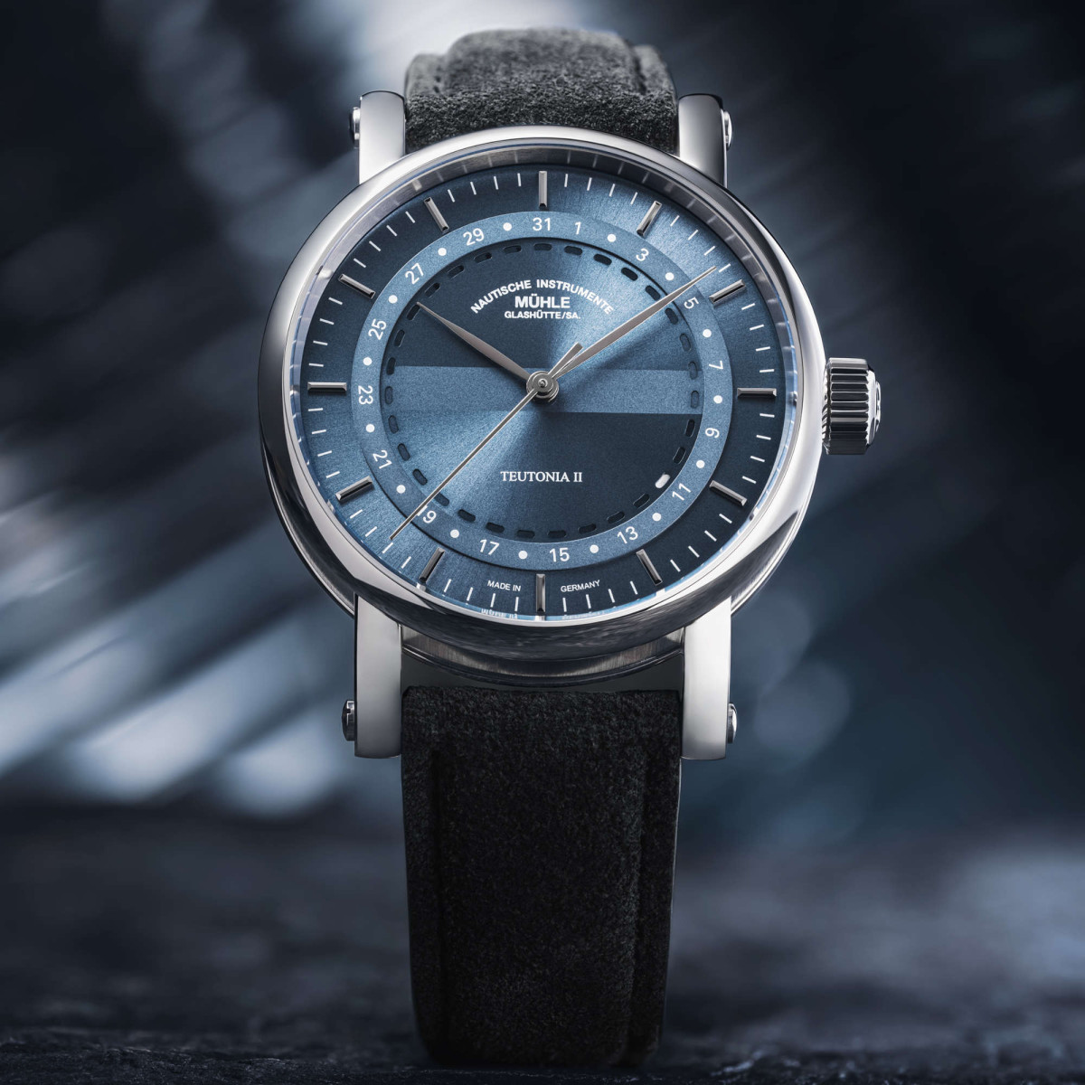 Ref. M1-33-52-AB-I - Understatement mit einem Hauch Extravaganz: Dafür steht die Teutonia II Ringdatum. Denn bei der neuen Mühle-Uhr tritt das Datum ganz selbstbewusst aus dem Schatten des Zifferblatts heraus und wird als komplett sichtbare Skala auf einem leicht erhabenen Zifferblattring dargestellt.