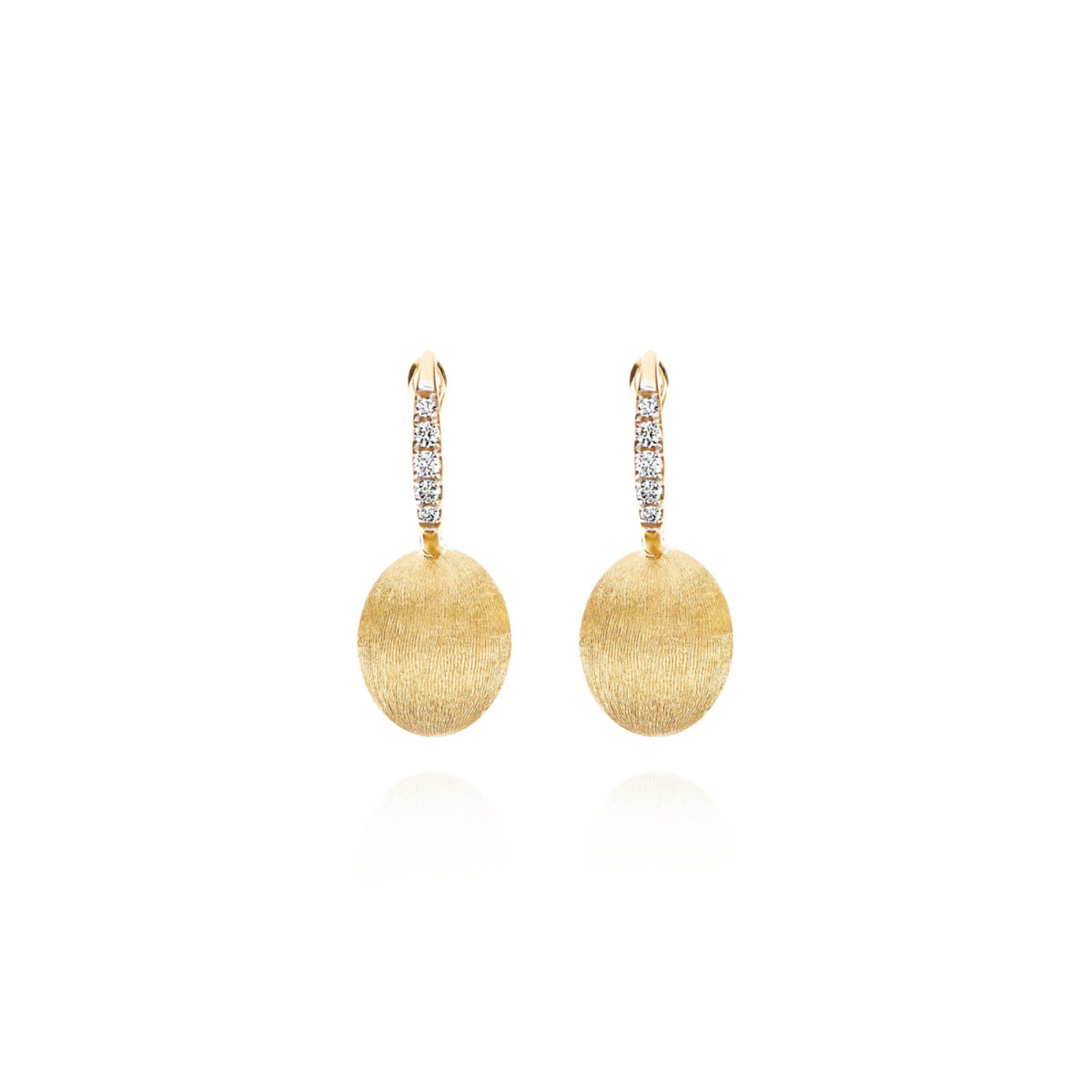 Ref. OS17-583 - Raffinierte Ohrringe aus 18kt Gold, gekrönt von eleganten Details aus Diamanten. Die ausgefeilte Bearbeitung des Goldes spielt mit dem Licht, spiegelt es suggestiv wider, und besiegelt dadurch die Begegnung von Natur und Handwerk.