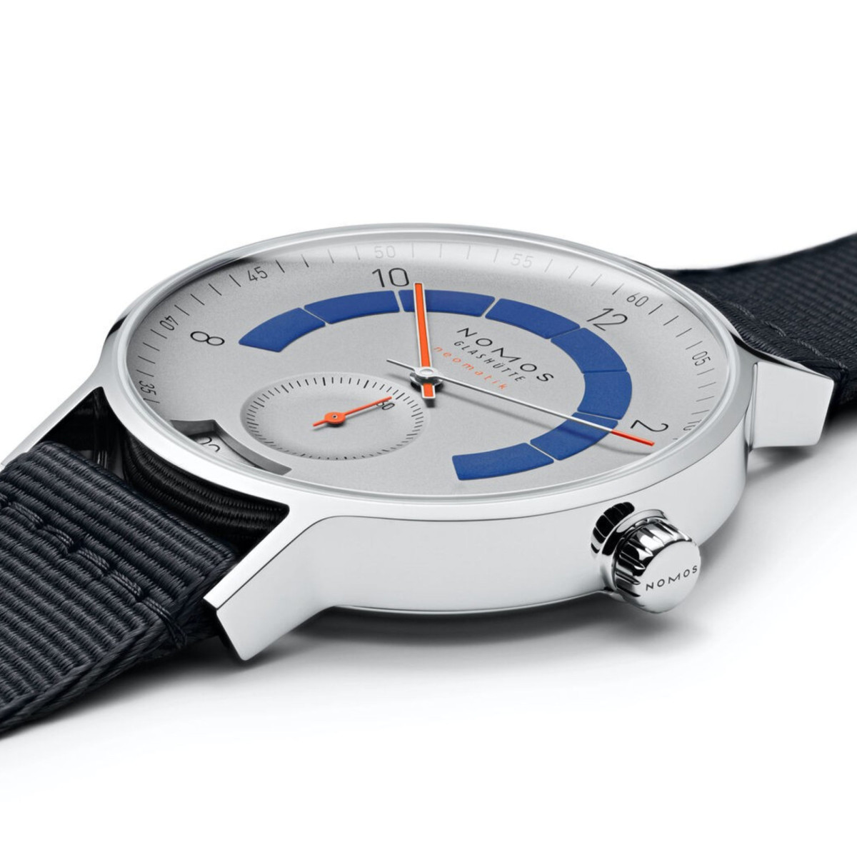 Zeiger: rhodiniert, Stundenzeiger mit Superluminova neonorange ausgelegt (blau nachleuchtend)