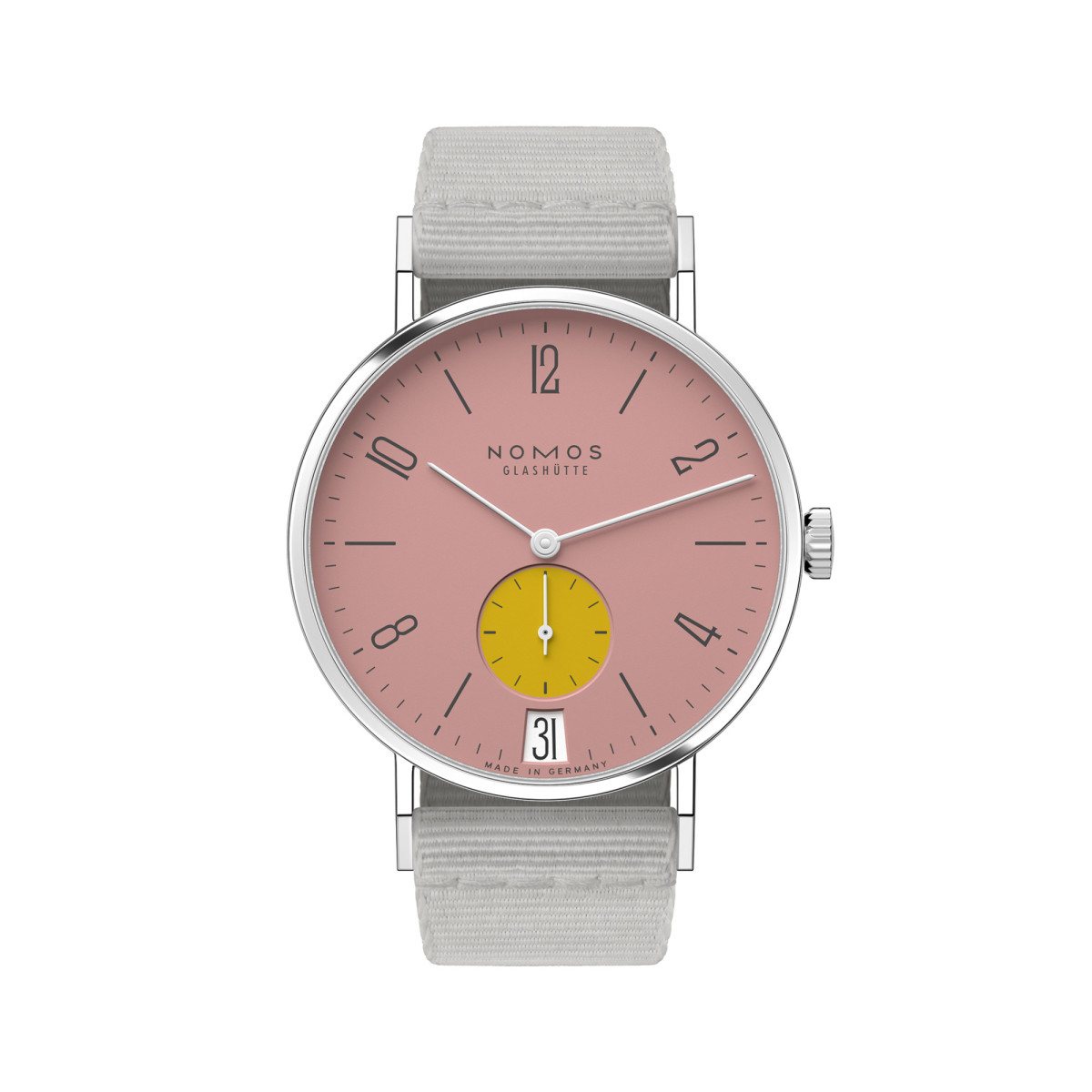 Ref.179.S7 - Die Ikone in Farbe. Voller Kraft und Komplexität. Für die Sonderedition der Handaufzugsuhr Tangente 38 mit Datumsfunktion wurden zahlreiche Elemente des Zifferblatts individuell auf den Charakter der Uhr abgestimmt. 31 besondere Modelle für jeden Tag des Monats sind daraus entstanden, 31 Persönlichkeiten – auf je 175 Exemplare limitiert. Tangente Datum Bubblegum ist eine fröhlich kunstsinnige Uhr: Die gelbe Sekunde auf rosa Grund wirkt wie ein sommerliches Seidenkleid, passt aber auch zu Anzug und Krawatte perfekt – nur Mut!