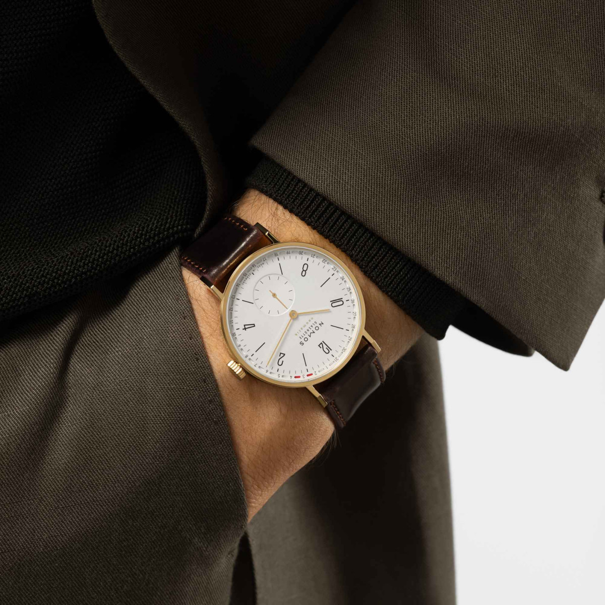 Ref. 196 - Ton in Ton mit goldenen Zeigern zum 18-karätigen Goldgehäuse und am feinen braunen Lederband wirkt die doré-Version von Tangente Gold neomatik 38 Update besonders warm und elegant. Und im ikonisch klaren Tangente-Design dabei überraschend modern – von einer innovativen Technologie im Inneren begleitet. Diese Glashütter Golduhr mit dem patentierten Ringdatum am Zifferblattrand bietet Stil und Leistung höchsten Werts. Unabhängige Mechanik, mit der sich die Besonderheit des Lebens feiern lässt.