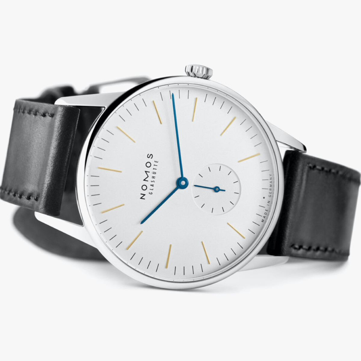 Ref. 384 - Mehr Orion: Mit 38 Millimetern Durchmesser reiht sich diese Uhr ein in die Reihe der größeren NOMOS-Modelle. Wirkt aber mit gewölbtem Blatt und Saphirglas besonders flach und elegant. Große Klasse auch: die temperaturgebläuten Zeiger auf weiß versilbertem Zifferblatt. Darunter arbeitet Handaufzugswerk Alpha – zuverlässig und höchst präzise.