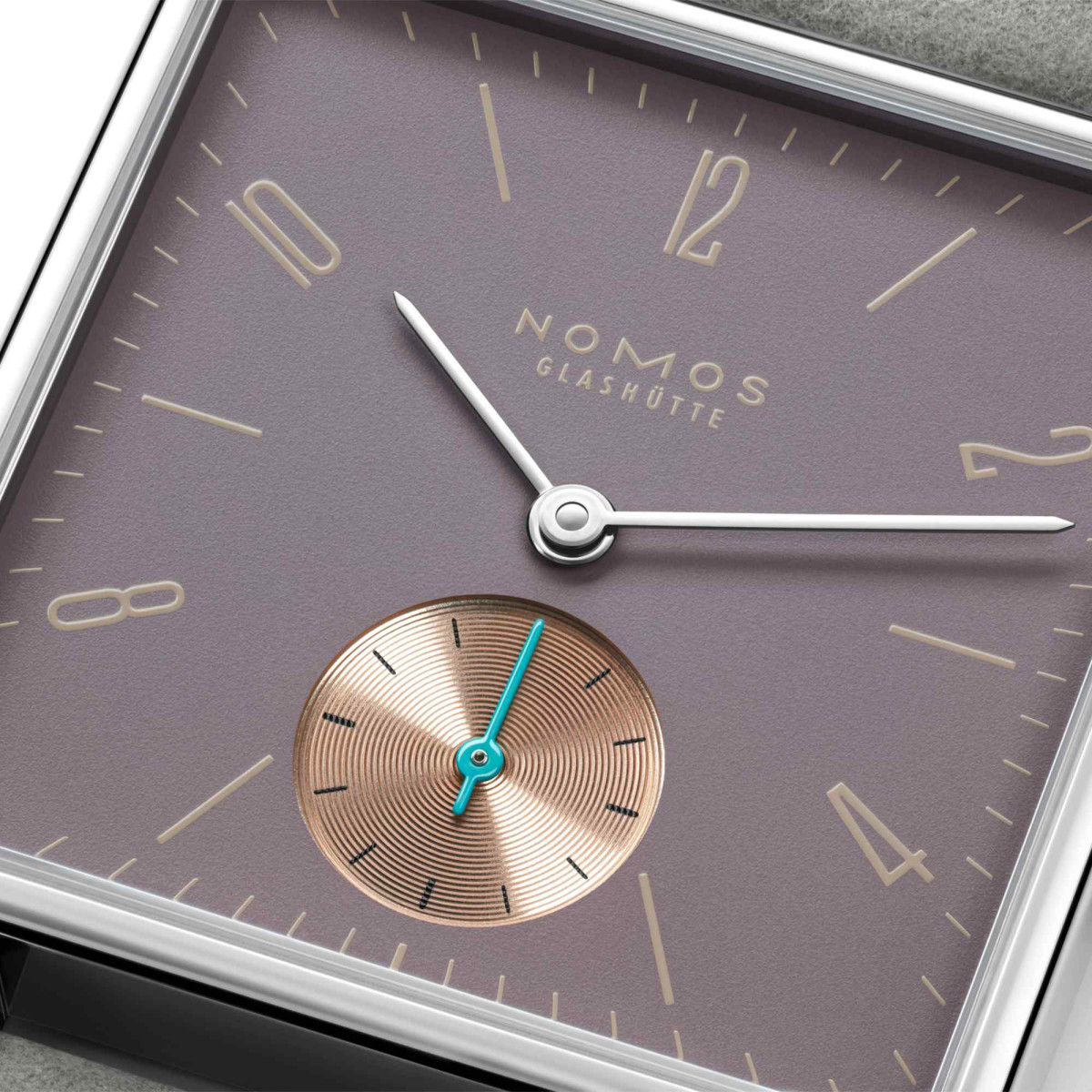 Ref. 425 - In kräftigem Aubergine signalisiert Tetra Selbstbewusstsein. Das luxuriöse Roségold der kleinen Sekunde fügt etwas Genießerisches hinzu, der türkis lackierte Sekundenzeiger zeigt Sinn für Humor. Am samtgrauen Band aus veganem Velours liegt die Handaufzugsuhr mit dem manufakturgefertigten Alpha-Kaliber weich am Arm. Wertvoll und präzise – einzigartige Uhrmacherkunst aus Glashütte