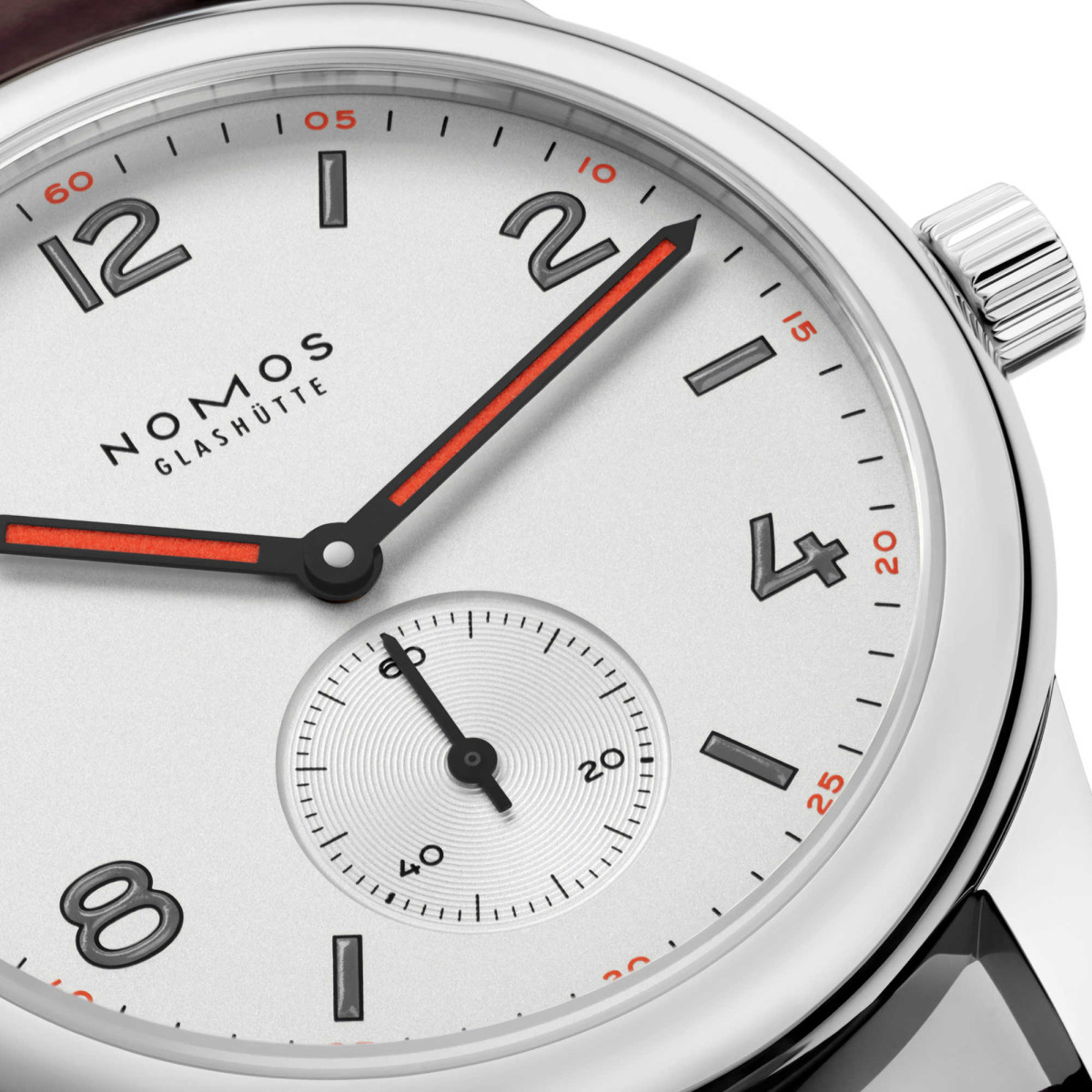 Ref. 701.1 - Sportlich, jung, unkonventionell: Club steckt Zuneigungsbekundungen (und andere Erschütterungen) locker weg. Gehäuse aus Edelstahl und Saphirglas: Hier kann nichts passieren. Die markanten Zeiger drehen selbstbewusst ihre Runden auf dem weiß versilberten Zifferblatt. Und NOMOS-Manufakturkaliber Alpha sorgt für höchste Präzision.