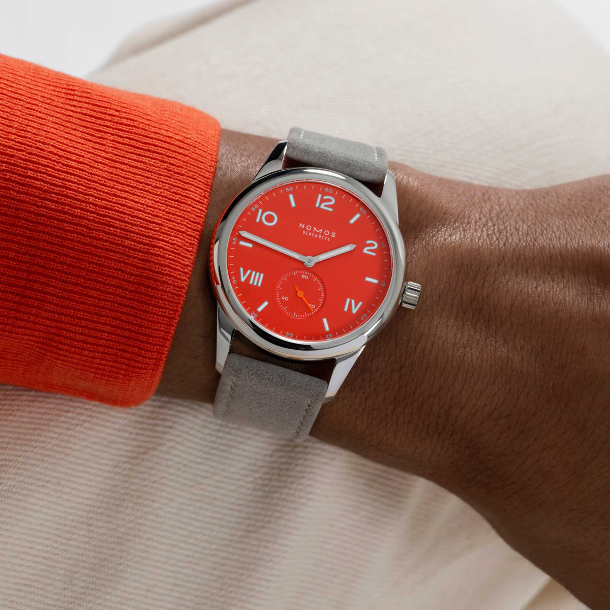Ref. 723 - Eigentlich kann Club Campus in diesem nicht zu stoppendem Rot gar nicht groß genug sein. Die lebensvolle Jahrgangsuhr hier mit einem Durchmesser von 38,5 Millimetern für noch mehr Energie und Selbstbewusstsein am Handgelenk. Manufakturgefertigtes Handaufzugskaliber, deutliche Ziffern, Indexe und Zeiger, die dank Superluminova blau nachleuchten, am veganen Band und im robusten Edelstahlgehäuse, das bis 10 atm Wasserdruck dichthält.