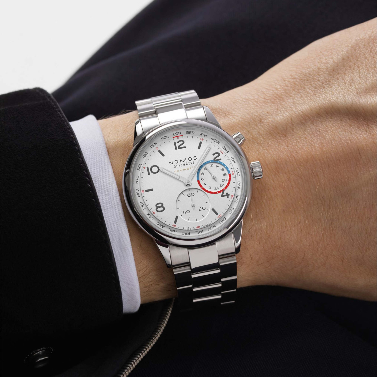 Ref. 792.SB - Für die ganze Welt und jeden Tag gemacht: Mit klassisch weiß versilbertem Zifferblatt wirkt die vielschichtige Anzeige von Club Sport neomatik Weltzeit besonders klar und reduziert. Diese Worldtimer-Version ist vielseitig und alltagstauglich, dabei elegant flach und konsequent funktional. Superluminova – weiß auf den Zeigern und grau auf den Stundenindizes – leuchtet im Dunkeln blau nach. Ansonsten gibt es nur ganz feine strukturierende Farbakzente: die kleinen roten Ziffern am Rand des Hauptzifferblatts, der rote Strich unter dem Städtecode der ausgewählten Zeitzone sowie der äußere Ring der Heimatzeit-Anzeige.