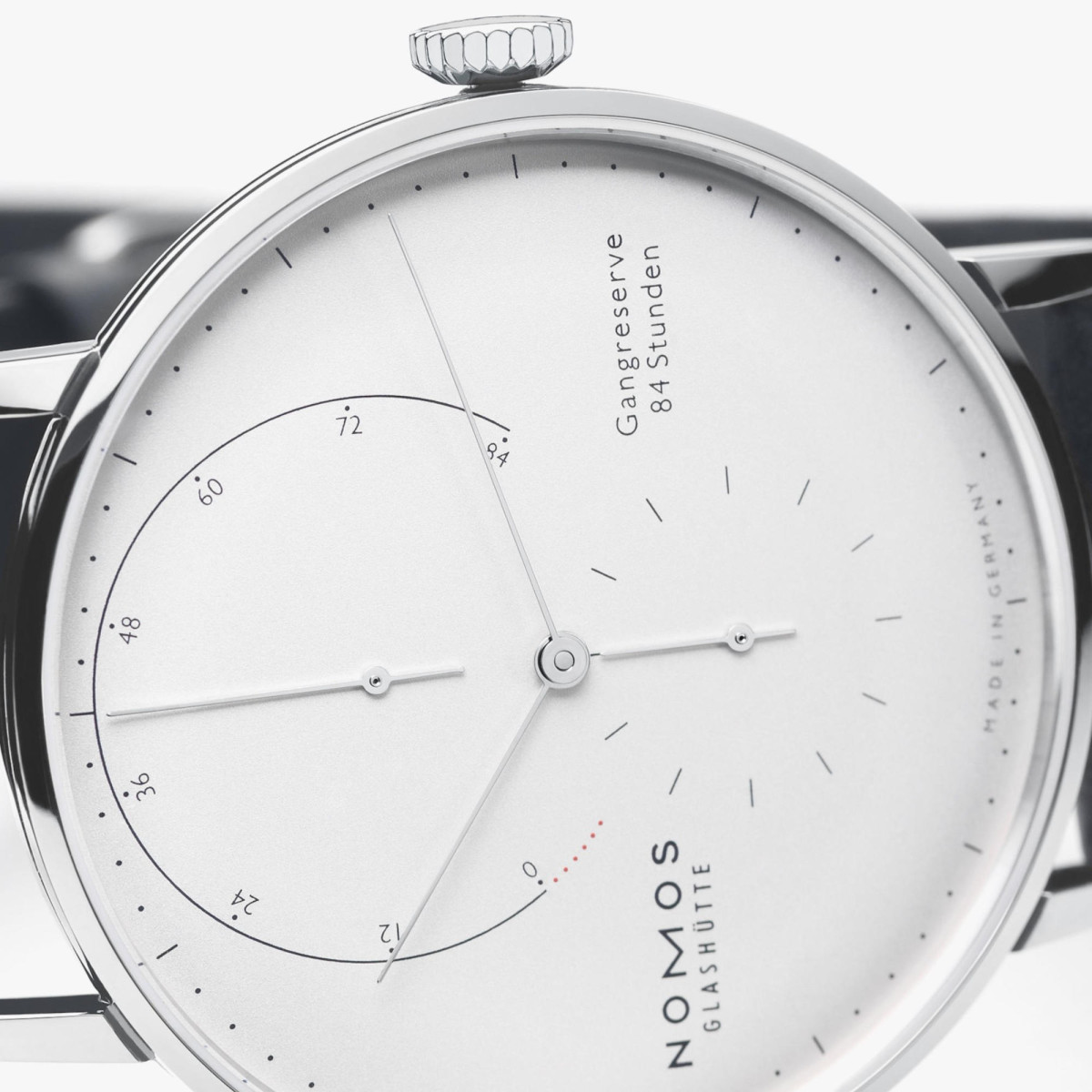 Ref. 931 - Die Quintessenz von NOMOS Glashütte: Lambda Weißgold. Wie mit spitzem Bleistift gezeichnet, voller Glashütter Uhrmachertradition und doch moderner als alles, was je die Zeit angezeigt hat – ein wunderschönes Instrument höchster Präzision. Die großzügige Gangreserveanzeige zeigt an, wann aufgezogen werden muss: nach erst dreieinhalb Tagen.