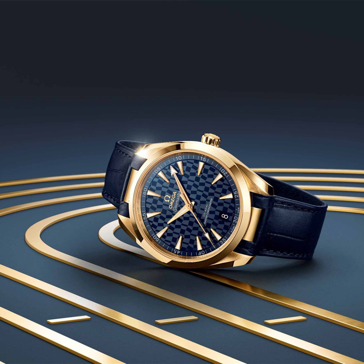 Ref. 522.53.41.21.03.001 - Dieser Zeitmesser aus 18 K Gelbgold mit einem Durchmesser von 41 mm ist eine wunderbare Hommage an OMEGAs Rolle als offizieller Zeitnehmer bei den Olympischen Spielen 2020 in Tokio. - Das polierte blaue Keramikzifferblatt zeichnet sich durch ein lasergraviertes Tokio-2020-Motiv aus und verfügt über ein Datumsfenster bei 6 Uhr. Die Zeiger und Indizes aus 18 K Gelbgold wurden mit weißer Super-LumiNova gefüllt. - Auf dem polierten und gebürsteten, mit vier Schrauben fixierten Gehäuseboden ist ein Wellendekor mit dem Tokio-2020-Logo in den Olympischen Farben zu sehen. Außerdem gewährt er einen klaren Blick auf das Uhrwerk: OMEGAs Master Chronometer Kaliber 8901. - OMEGAs Zeitmesser für Tokio wird von einem integrierten blauen Alligatorlederarmband mit einer polierten und gebürsteten Faltschließe aus 18 K Gelbgold am Handgelenk gehalten. Außerdem wird er in einer speziellen Präsentationsbox geliefert, in der er sicher aufbewahrt werden kann, wenn er nicht getragen wird.