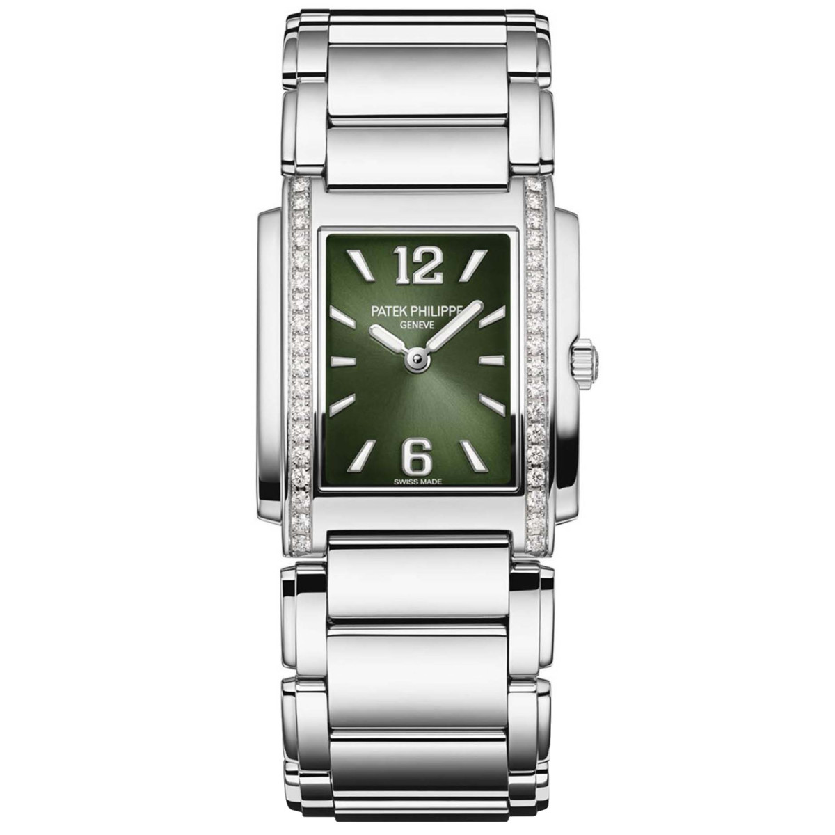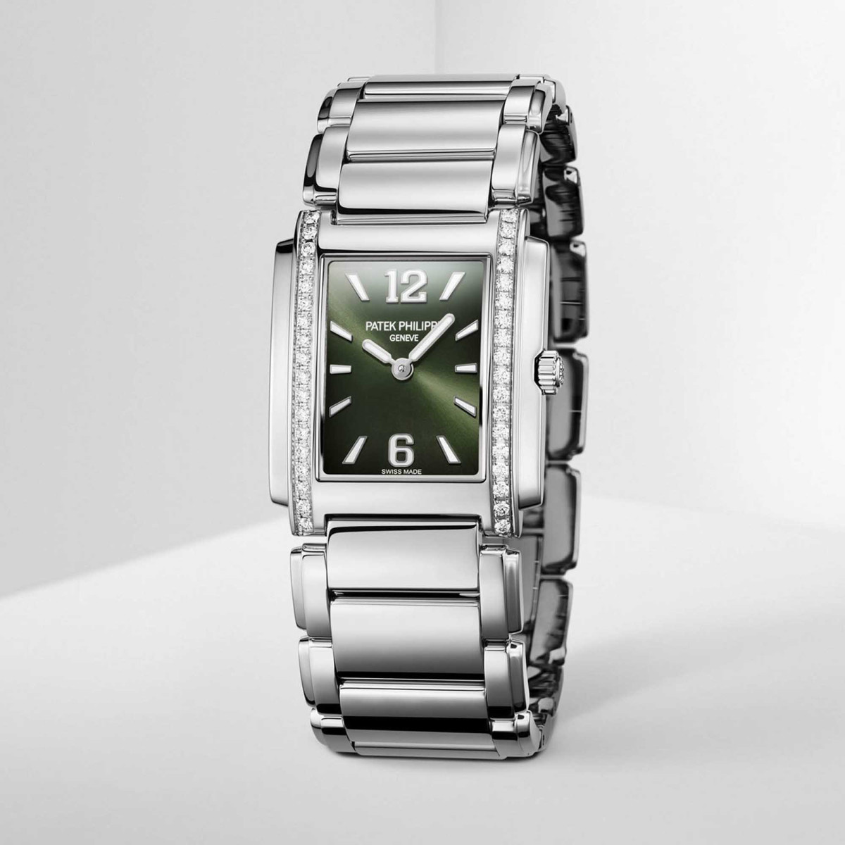 Ref. 4910/1200A-011 - Die 1999 lancierte Twenty~4 — die erste Kollektion von Patek Philippe ausschließlich für Damen — wurde als stilvolle Begleiterin im Alltag moderner, aktiver Frauen konzipiert. Sie kann zu jeder Tages und Nachtzeit und zu jedem Anlass getragen werden, weshalb sie sich als der Inbegriff zeitloser Eleganz schlechthin etabliert hat. Das neue, zeitgenössische und elegante Zifferblatt in einem Olivton sorgt mit den aufgesetzten Ziffern 12 und 6 und den abgerundeten Stabzeigern für einen optimalen Lesekontrast. Die ausgefallene Form des rechteckigen, abgerundeten Gehäuses mit zweistufigen Anstößen ist vom Art Déco inspiriert und wird durch eine Reihe von 18 Diamanten hervorgehoben, die auf beiden Seiten des Zifferblatts eingesetzt sind. Die mechanischen Komponenten des Quarzkalibers E15 von Patek Philippe werden mit der gleichen hohen Qualität und Sorgfalt wie die anderen Uhrwerke der Manufaktur hergestellt und finissiert.