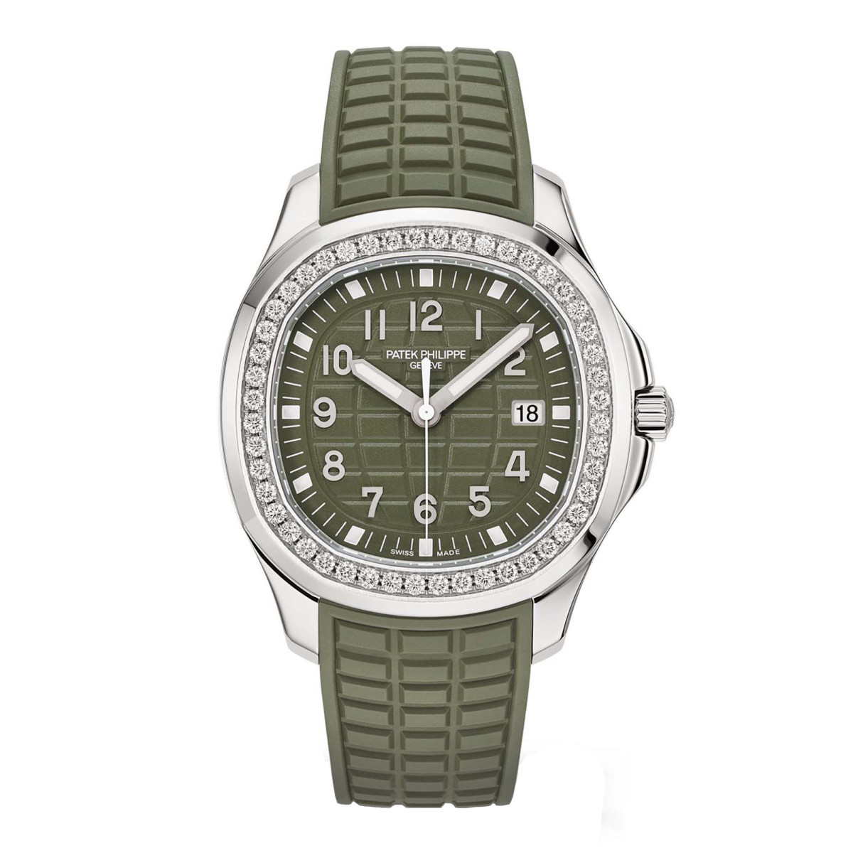 Ref. 5267/200A-011 - Patek Philippe hat die Stahl-Version der Aquanaut Luce mit Quarzwerk neu interpretiert: Der Gehäusedurchmesser wurde vergrößert (auf 38,8 mm), und das neue Armband aus Verbundmaterial geht fast nahtlos in das Gehäuse über. Als Ausdruck eines sportlich-schicken und modernen Stils wählte die Manufaktur bei diesem Vorzeigemodell kühnes Khakigrün für das Zifferblatt und das farblich abgestimmte Armband. Das sanft abgerundete, achteckige Gehäuse ist bis 120 Meter wasserdicht und wird durch abwechselnd polierte und satinierte Finissierungen veredelt. Die Lünette erstrahlt im Glanz von 48 Diamanten (ca. 1,11 K). Die patentierte Sicherheitsfaltschließe ist mit vier voneinander unabhängigen Rasten ausgestattet.
