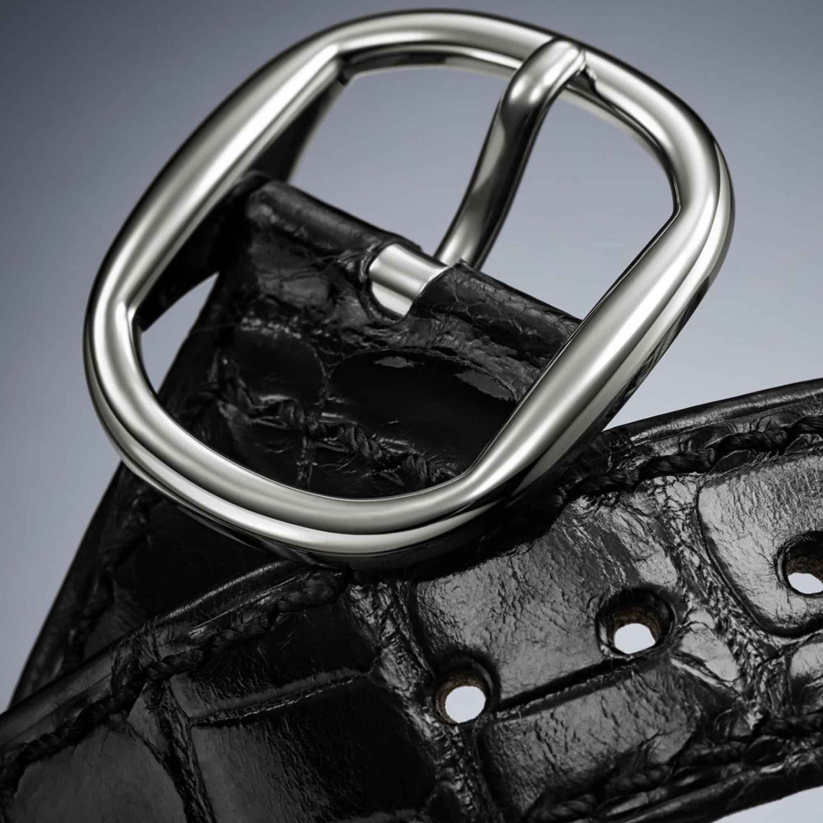 Alligatoreleder mit quadratischen Schuppen, handgenäht, schwarz glänzend. Dornschließe