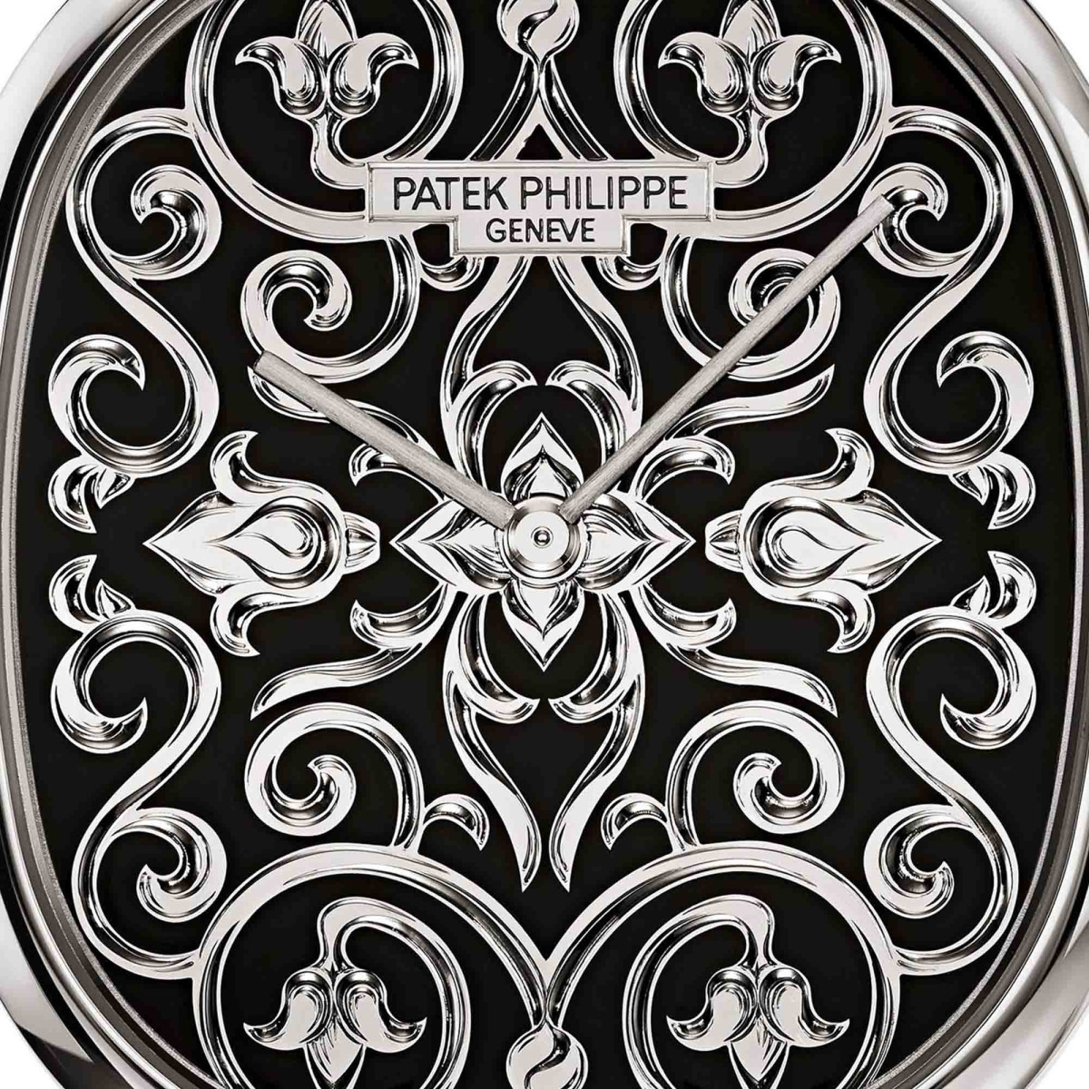 Ref. 5738/51G-001 - Das zeitlose Design der „Ellipse d’Or“ verbindet sich hier mit der Finesse hoher Handwerkskunst zu einem neuen Zeitmesser aus Weißgold in einem besonders ausgefallenen Look. Die handguillochierte Zifferblatt-Rondelle aus 18 Karat Gold wölbt sich leicht nach unten. So wird genügend Platz für das schwarze „Grand-Feu“-Email geschaffen. Diese Technik nennt sich „Champlevé“. Die Gravur der verbleibenden erhabenen goldenen Bereiche mit Voluten und Arabesken erfolgte vollständig von Hand. Unter diesem kunstvoll bearbeiteten Zifferblatt schlägt das Herz des extraflachen Kalibers 240 mit automatischem Aufzug.