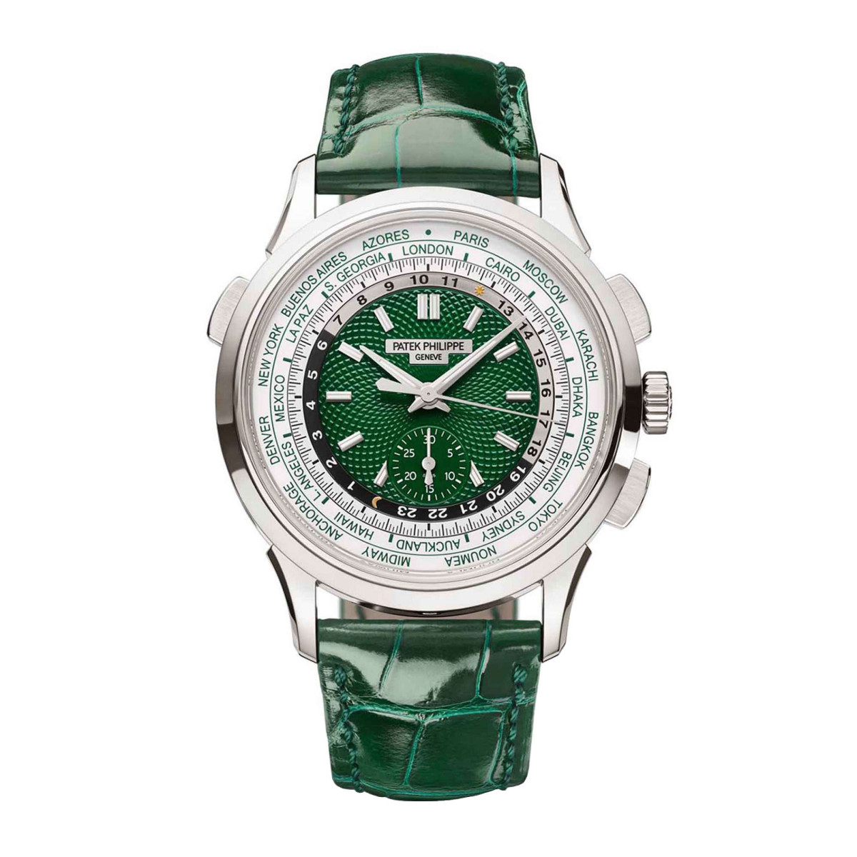Ref. 5930P-001 - Die Referenz 5930 in Platin, Weltzeituhr mit Flyback-Chronograph und automatischem Aufzug, wurde mit einem grünen Zifferblatt und grünem Armband lanciert. Dieses neue Modell kombiniert klassisches Design mit sportlichem Look. Das handguillochierte Motiv in der Zifferblattmitte ist Ausdruck hoher Handwerkskunst bei Patek Philippe. Die Weltzeitfunktion zeigt die Zeit aller 24 Zeitzonen gleichzeitig an. Ein exklusiver, patentierter Mechanismus ermöglicht das Einstellen der Zeitzone durch Betätigen des Drückers bei 10 Uhr.