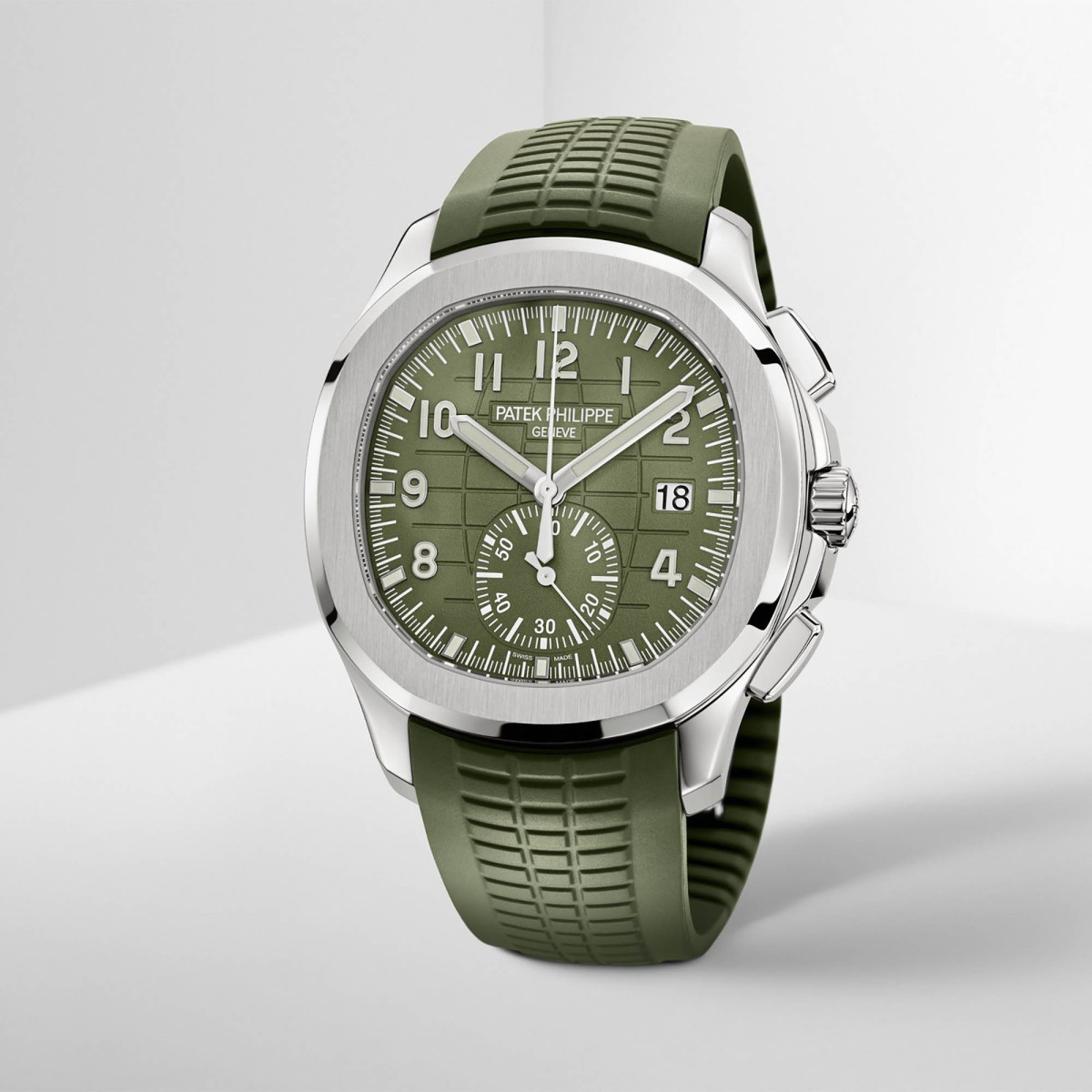 Ref. 5968G-010 - Patek Philippe rückt mit der ersten Weißgold-Ausführung des Aquanaut Flyback-Chronographen den «sportlich-schicken und modernen» Charakter dieses Modells mit automatischem Aufzug ins Rampenlicht. Unterstrichen wird dieser Look durch ein Zifferblatt und ein farblich abgestimmtes Armband aus Verbundmaterial in kühnem Khakigrün. Das bis 120 Meter wasserdichte Gehäuse wird durch abwechselnd polierte und satinierte Finissierungen veredelt. Der 60-Minuten-Zähler bei 6 Uhr greift die Form der sanft abgerundeten, achteckigen Lünette auf. Die patentierte Sicherheitsfaltschließe ist mit vier voneinander unabhängigen Rasten ausgestattet.